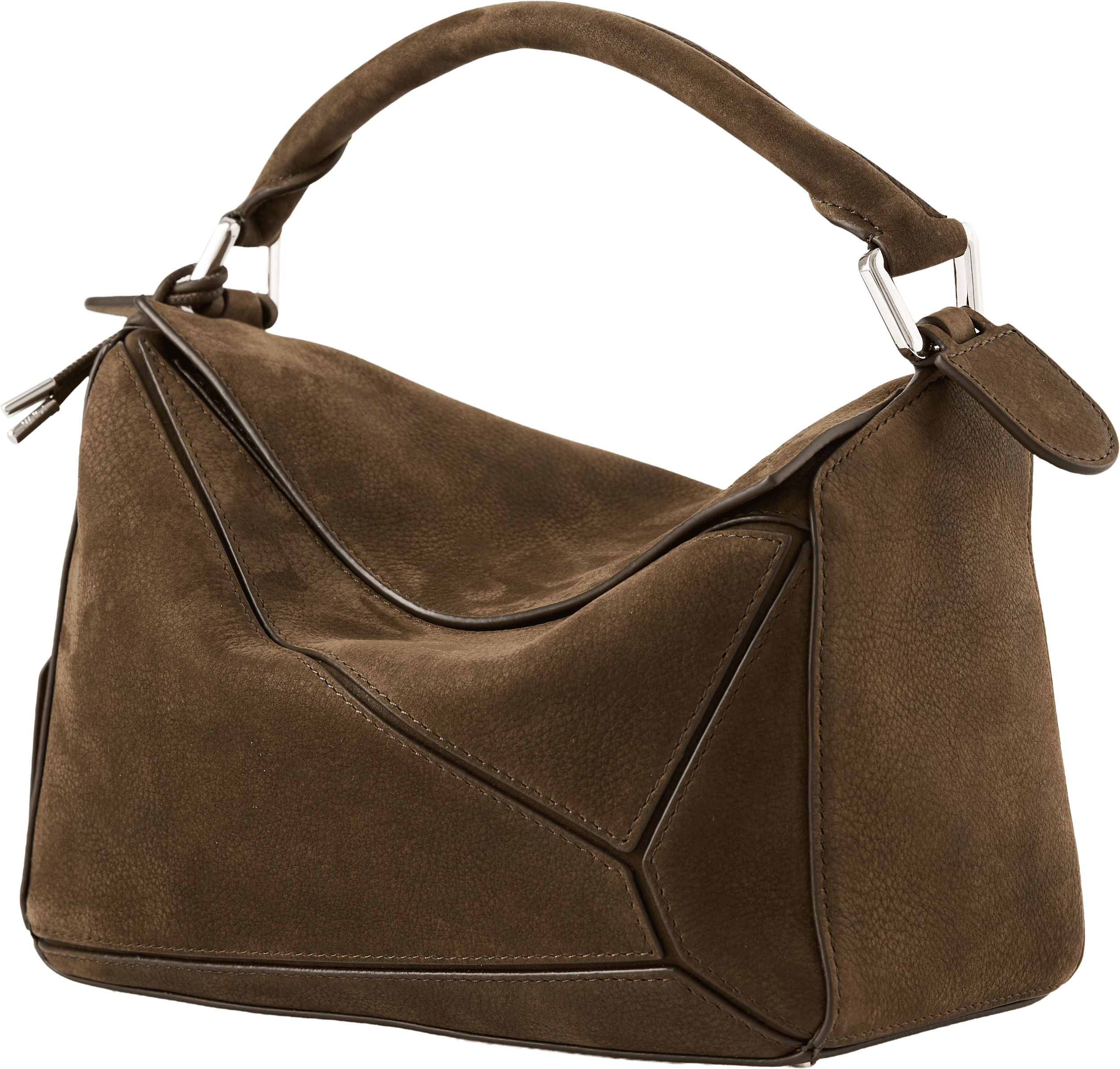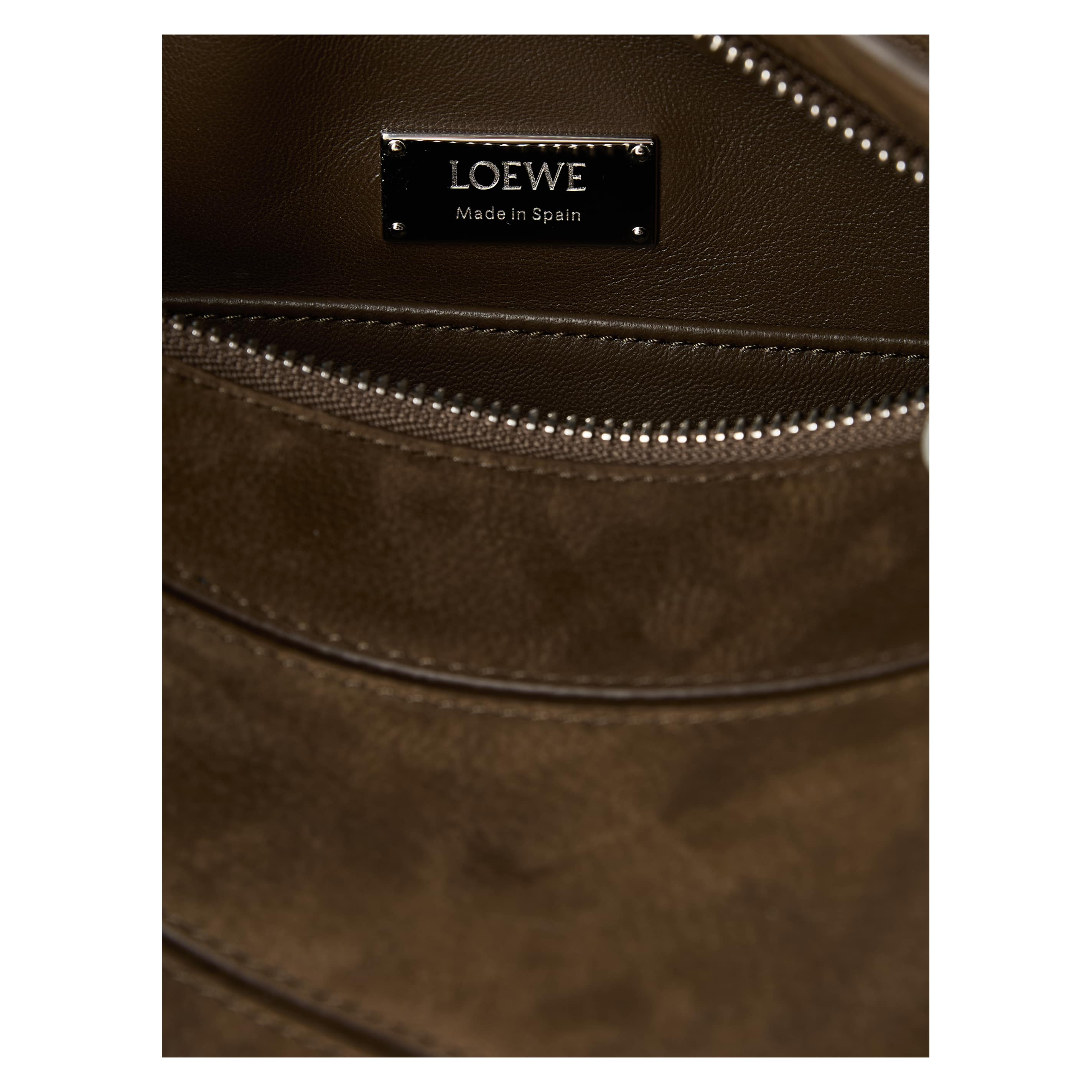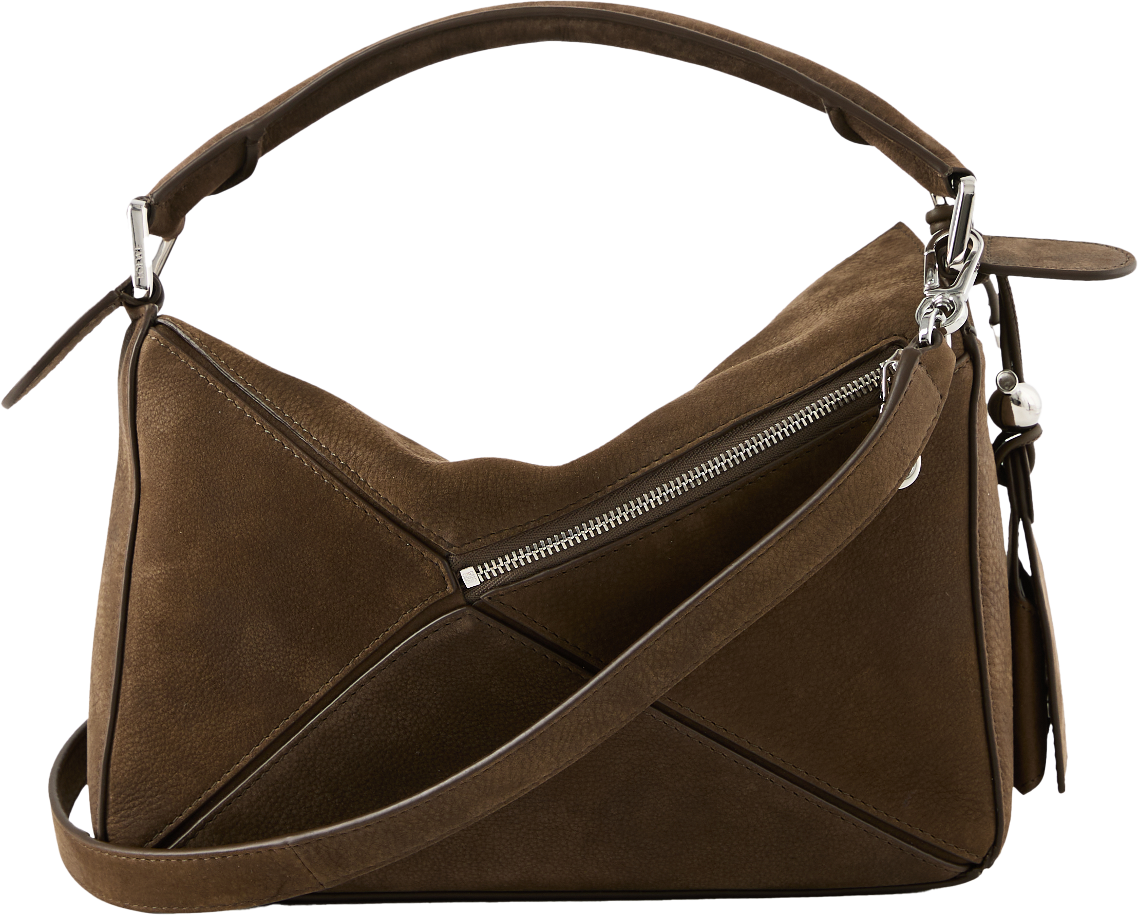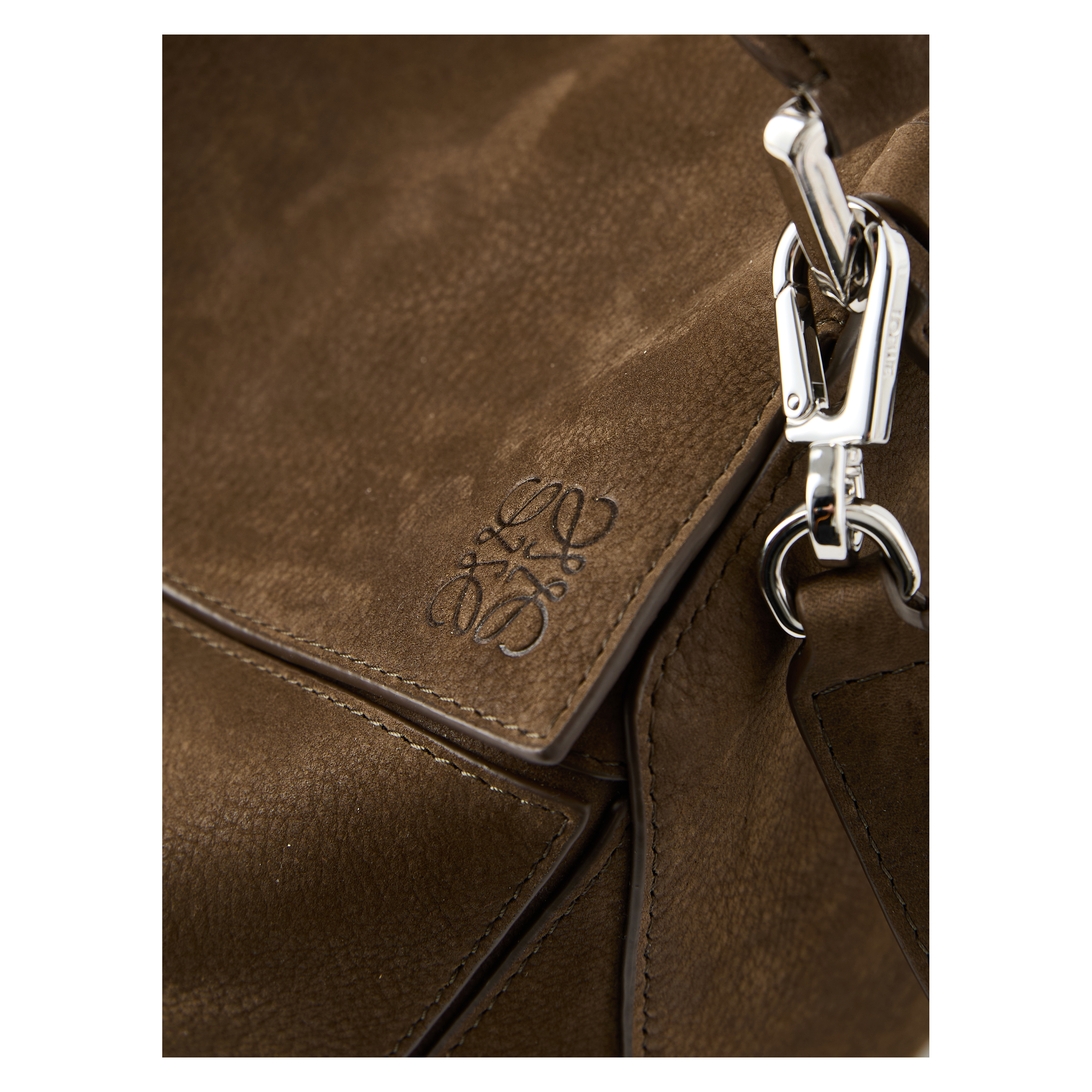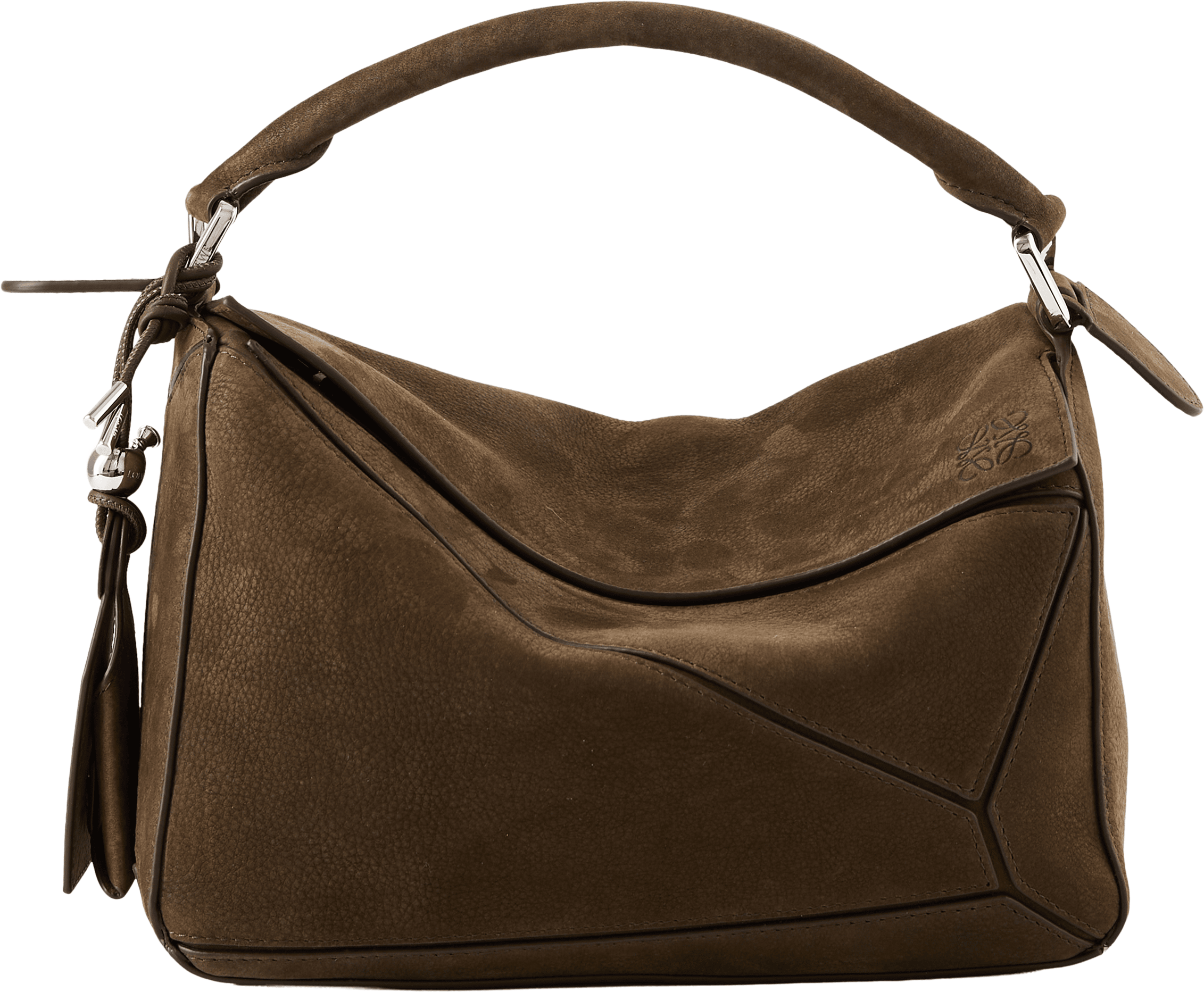 Die Handtasche 'Puzzle Featherlight' von LOEWE in Tundra wurde aus genarbtem Nubukleder gefertigt und mit silberfarbener Hardware abgerundet. Die Ballon-Würfel, das Innenfutter aus Nappa-Lammleder, der abnehmbare Schulterriemen, das rückseitige Reißverschlussfach sowie das geprägte Anagram zeichnen das Design aus.