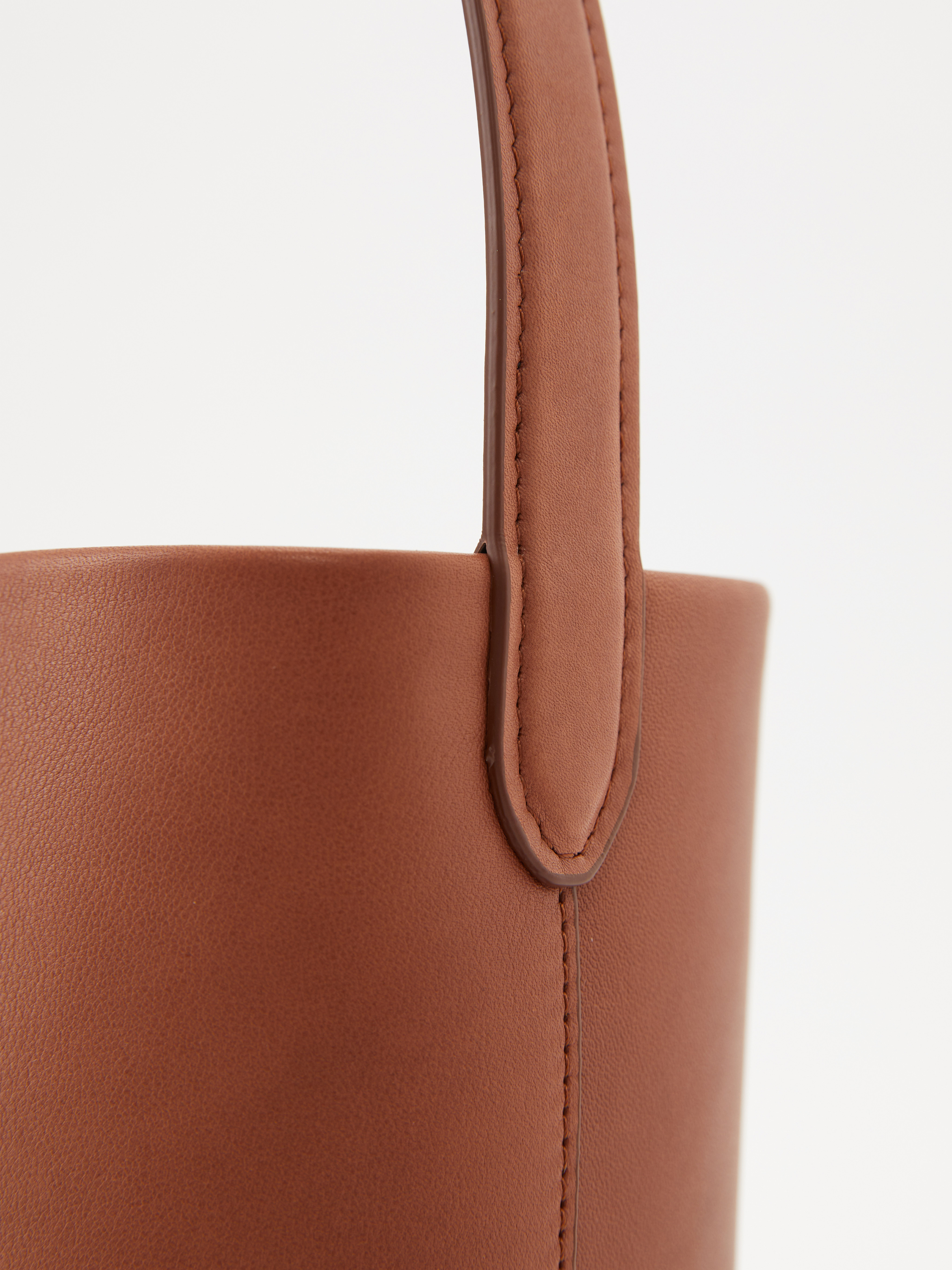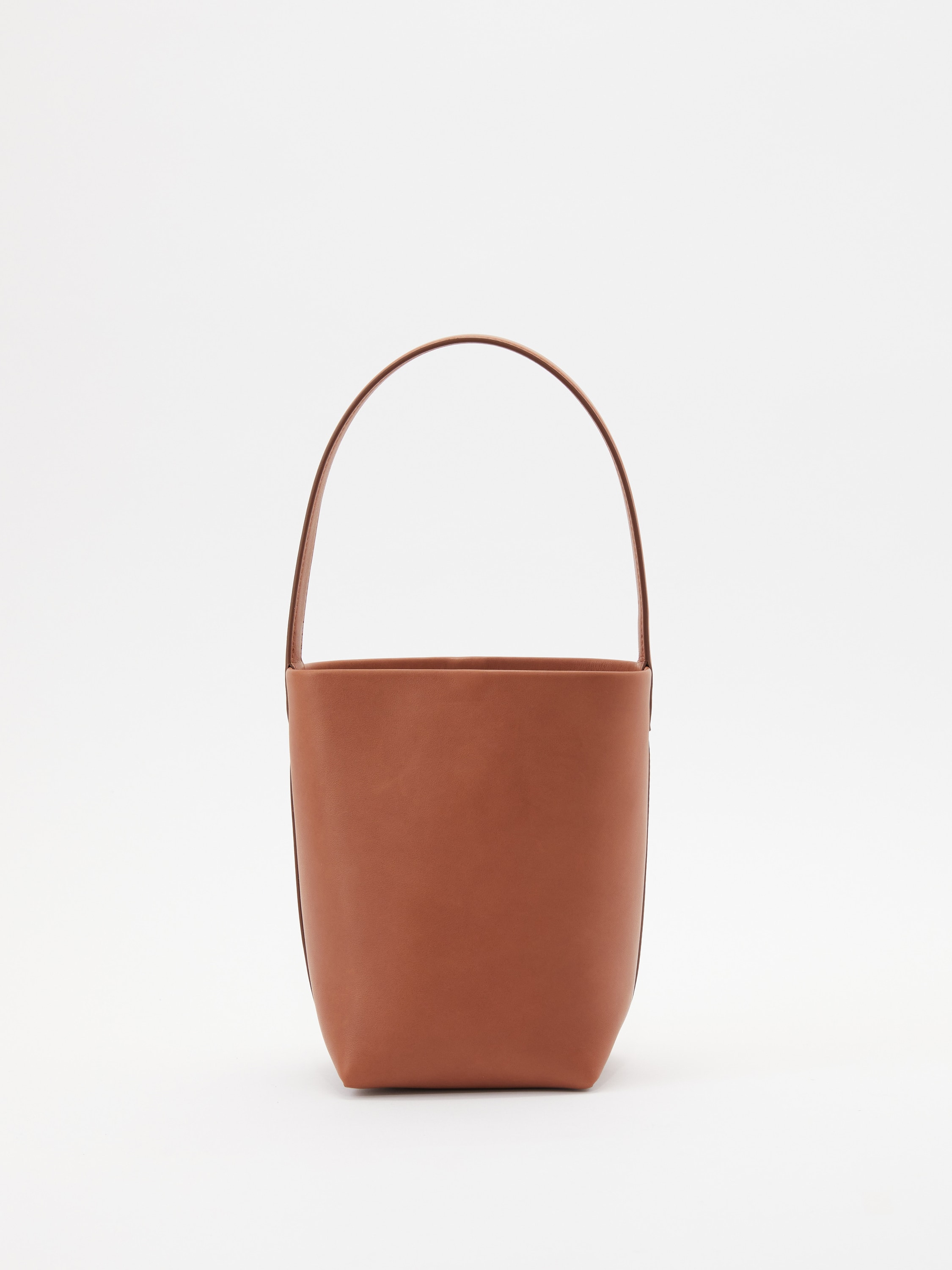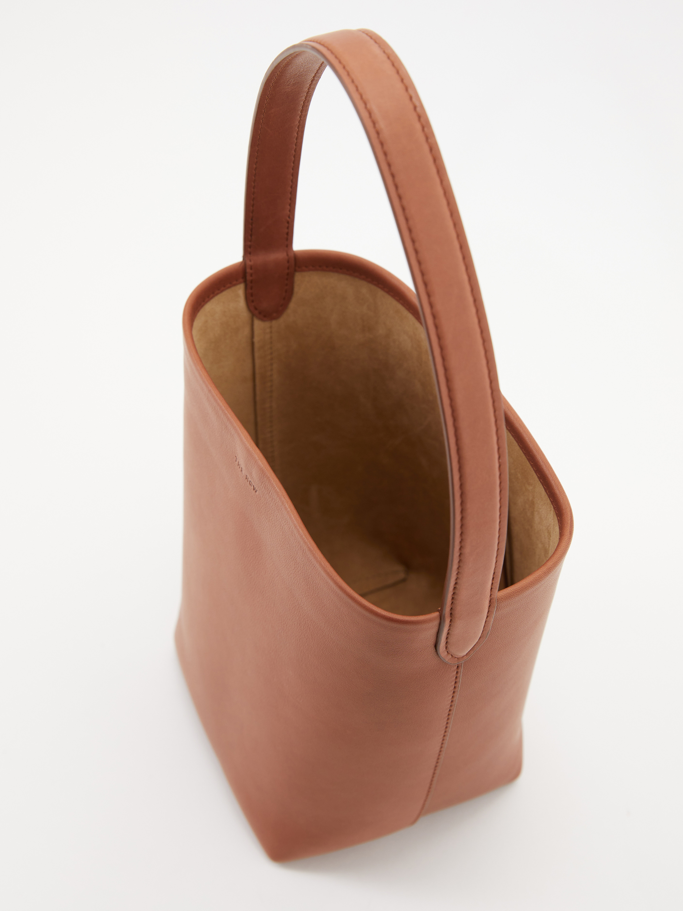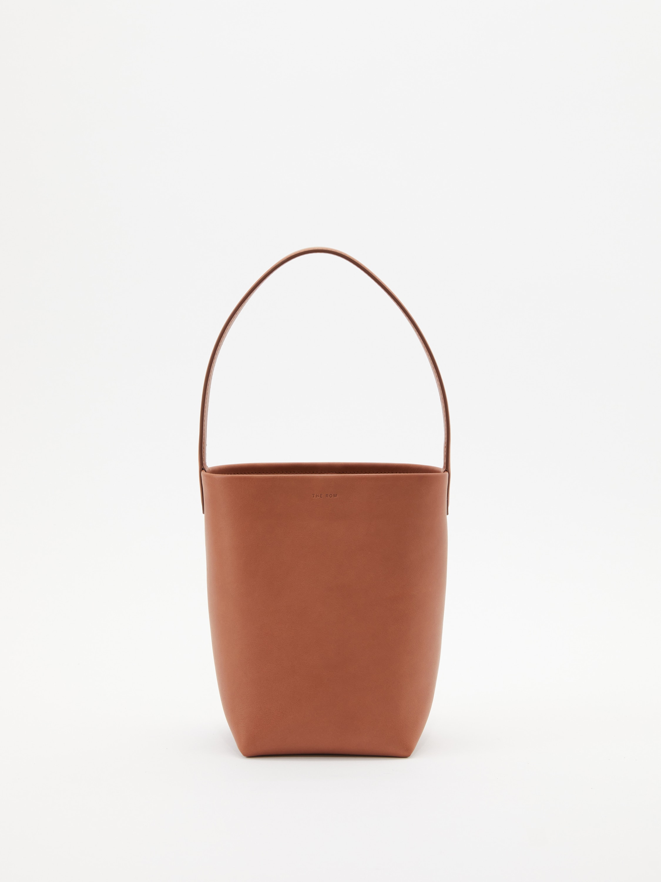 Die Handtasche 'Small N/S Park' in Braun von The Row wurde aus genarbtem Leder gefertigt und besticht durch das klassische Design. Das Modell wird durch die offene Oberseite mit Schnürverschluss und den flachen Griff zu einem stilvollen Begleiter der Saison.
