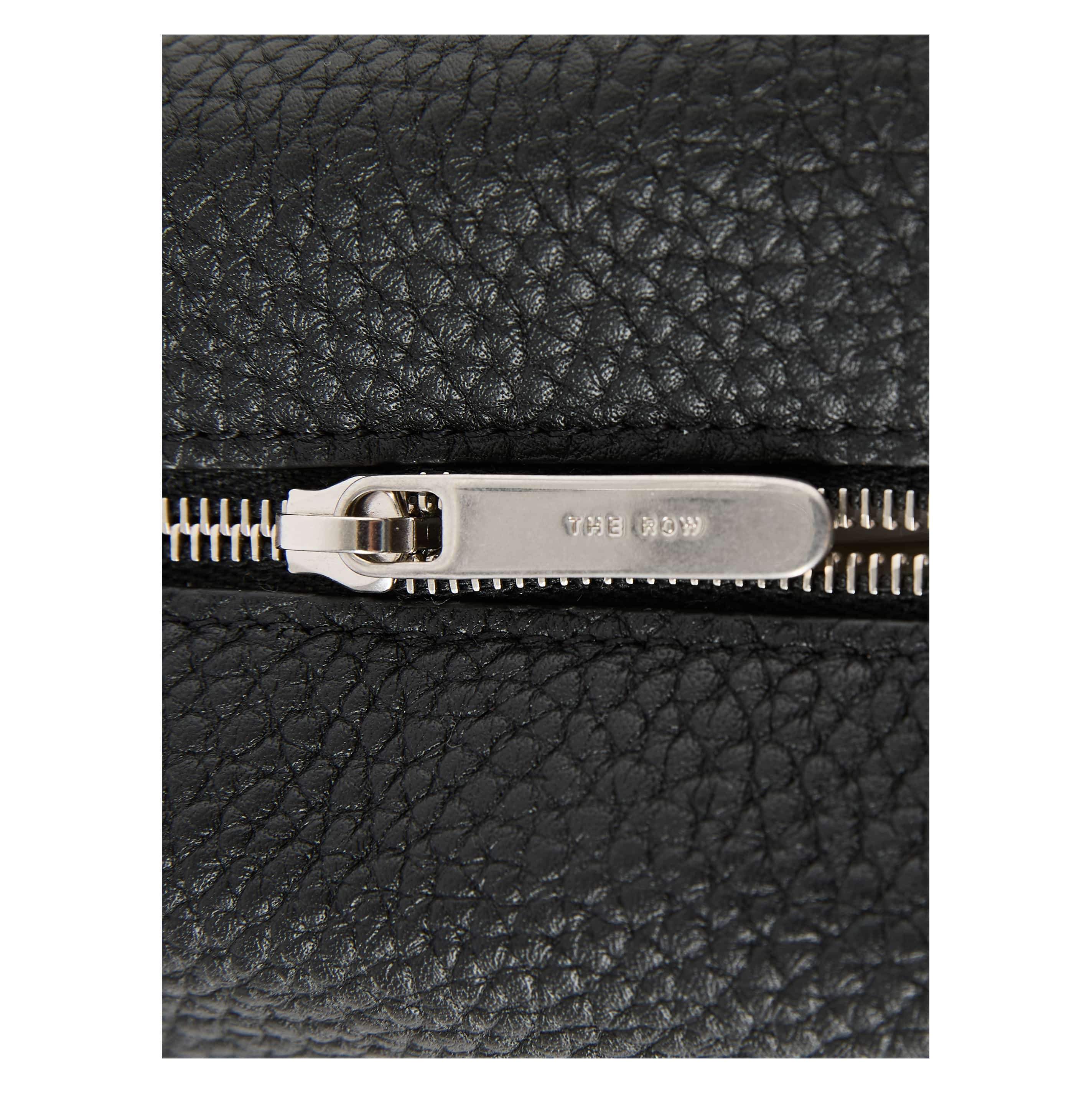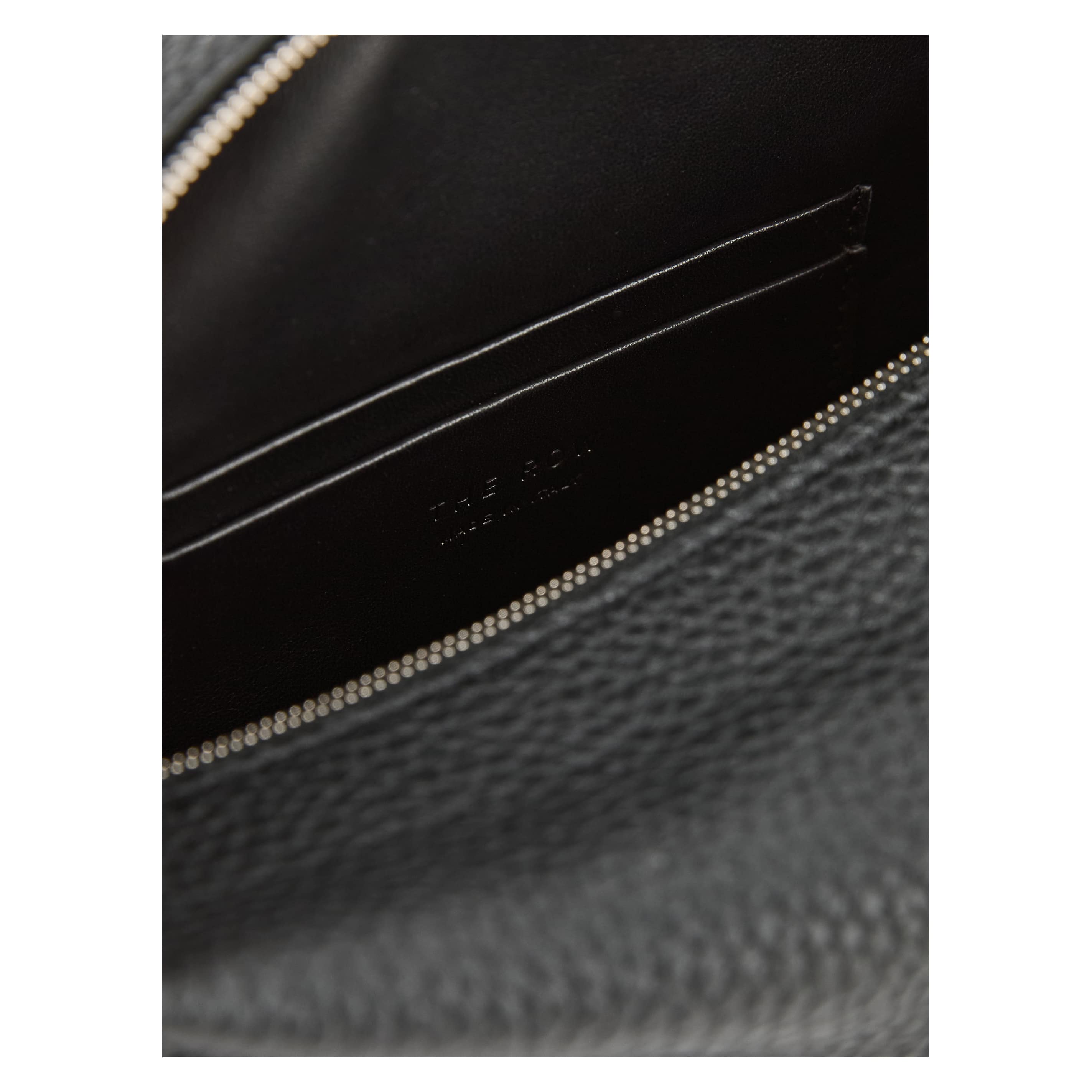 Die Clutch 'Squared Compact' in Schwarz von The Row wurde aus genarbtem Kalbsleder gefertigt und besticht durch ein zeitloses Design. Die silberne Hardware, die rechteckige Form, die leicht gefaltete Oberseite und das dezente Logo auf der Vorderseite runden das Modell stilvoll ab.