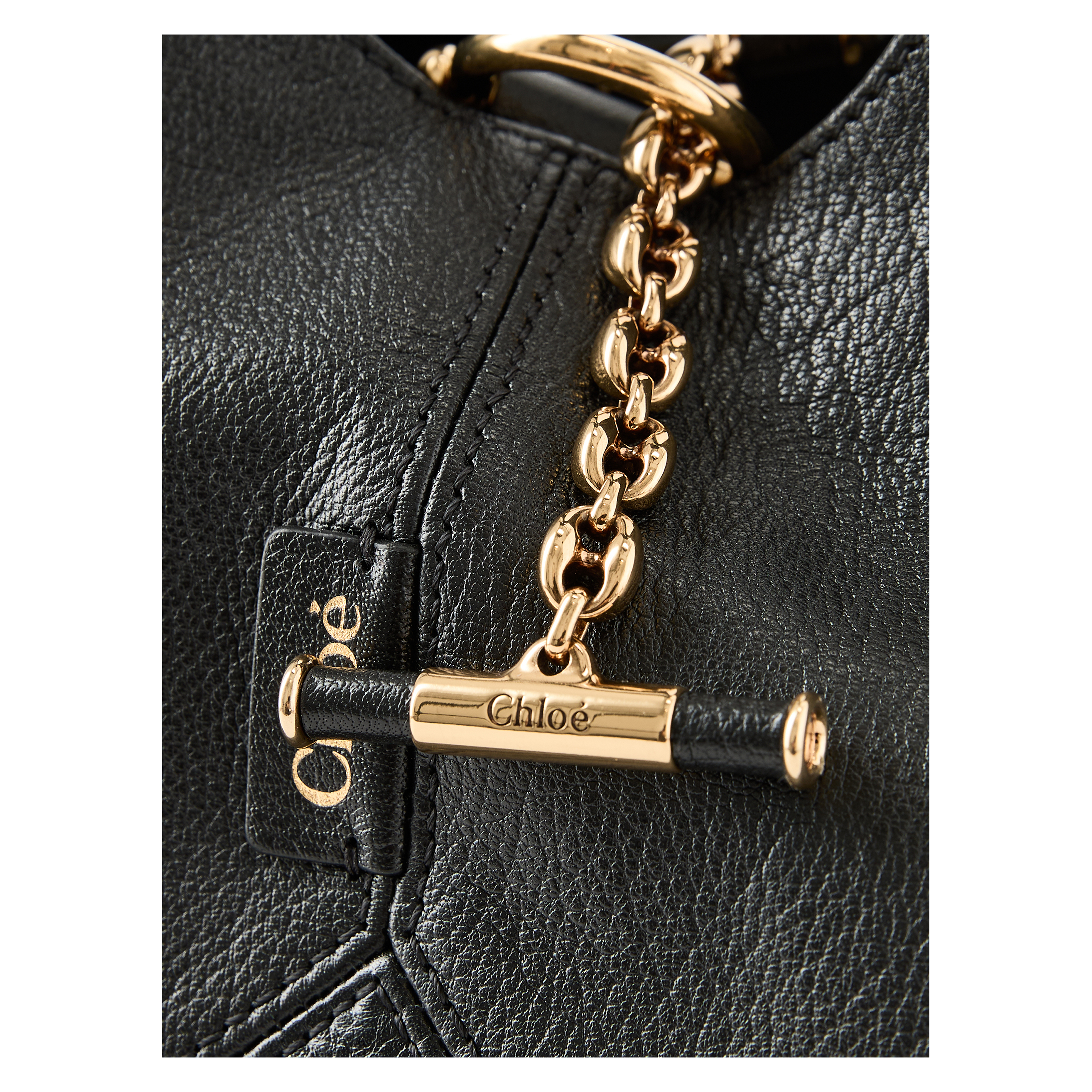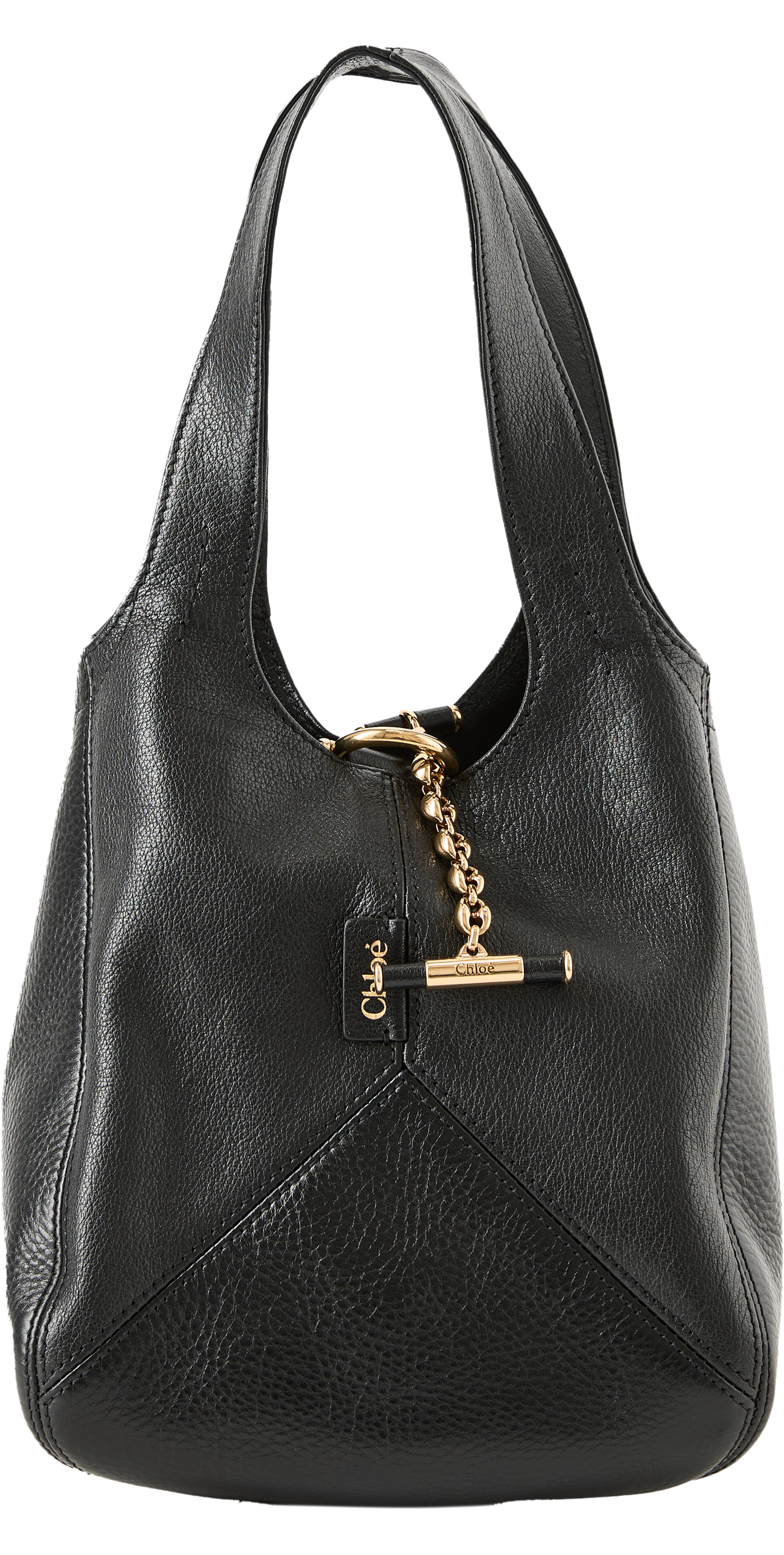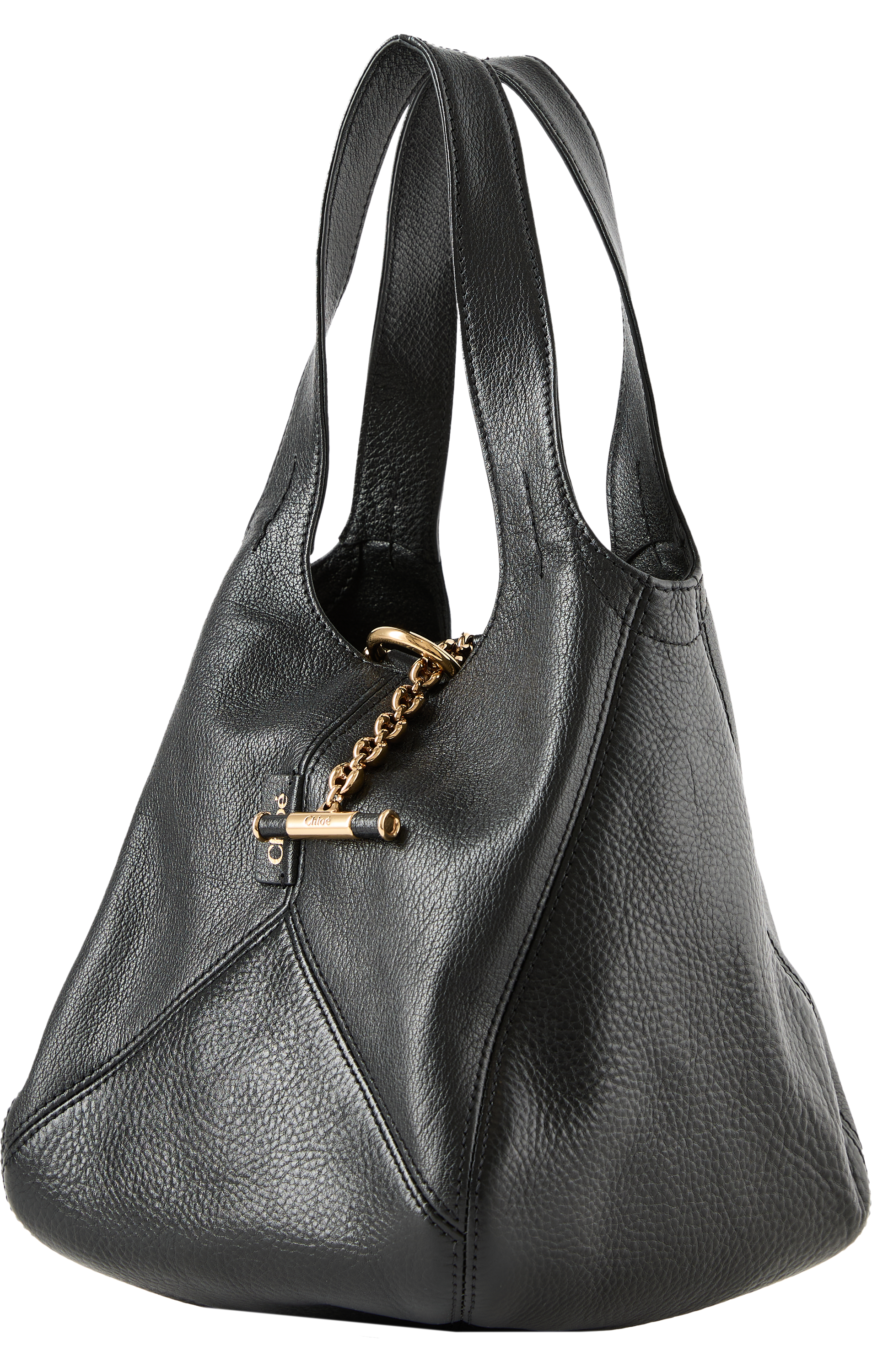 Die Handtasche 'Balloon' in Schwarz wurde aus genarbtem Büffelleder und glänzendem Rindsnarbenleder gefertigt und besticht durch eine geräumige Silhouette. Die zwei Schulterriemen, der Knebelverschluss mit Chloé-Gravur und die goldfarbenen Akzente zeichnen dieses moderne Modell aus. Die charakteristische Horse Medal der Maison ziert den Taschenboden.