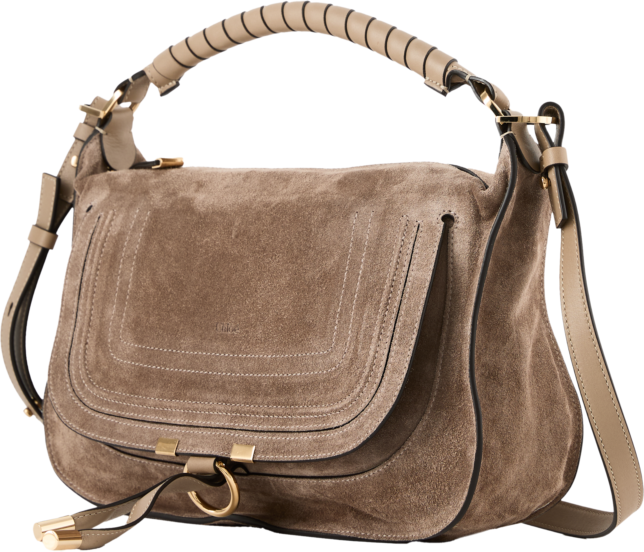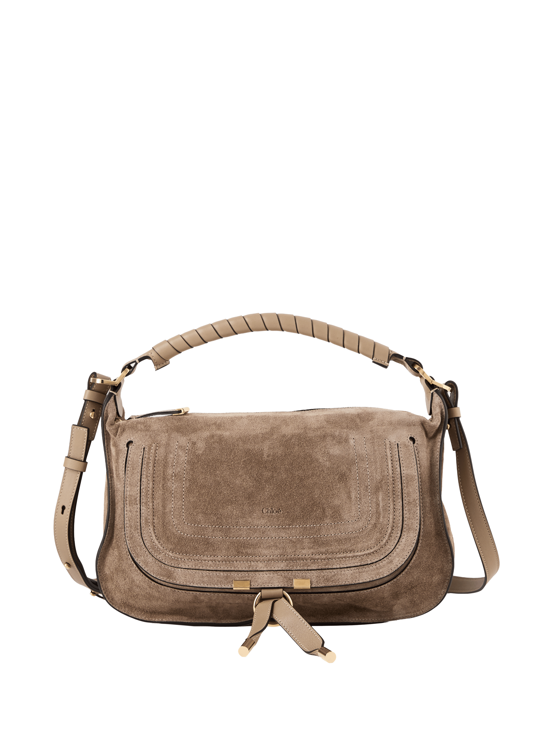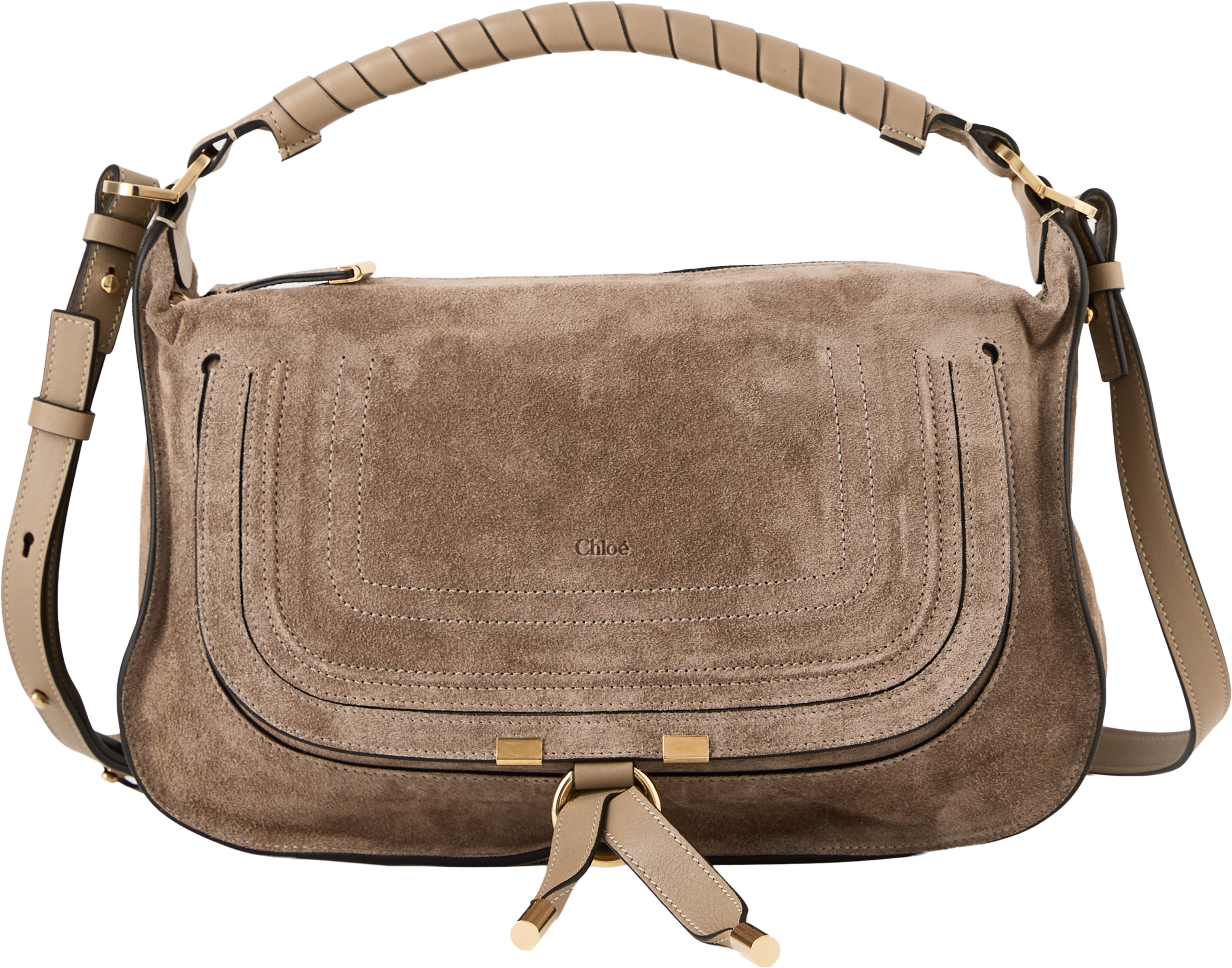 Die Handtasche 'Marcie Hobo' von Chloé in Boyish Brown wurde aus Kalbswildleder gefertigt und besticht durch die Neuinterpretation der ikonischen Day Bag mit einer lockereren Form. Die Sattelnähte, der einzelne handgewickelte Griff und die goldfarbenen Beschläge machen die Tasche zu einem sportlich-eleganten Klassiker. Die herabhängenden Lederquasten der Linie schließen den Überschlag.