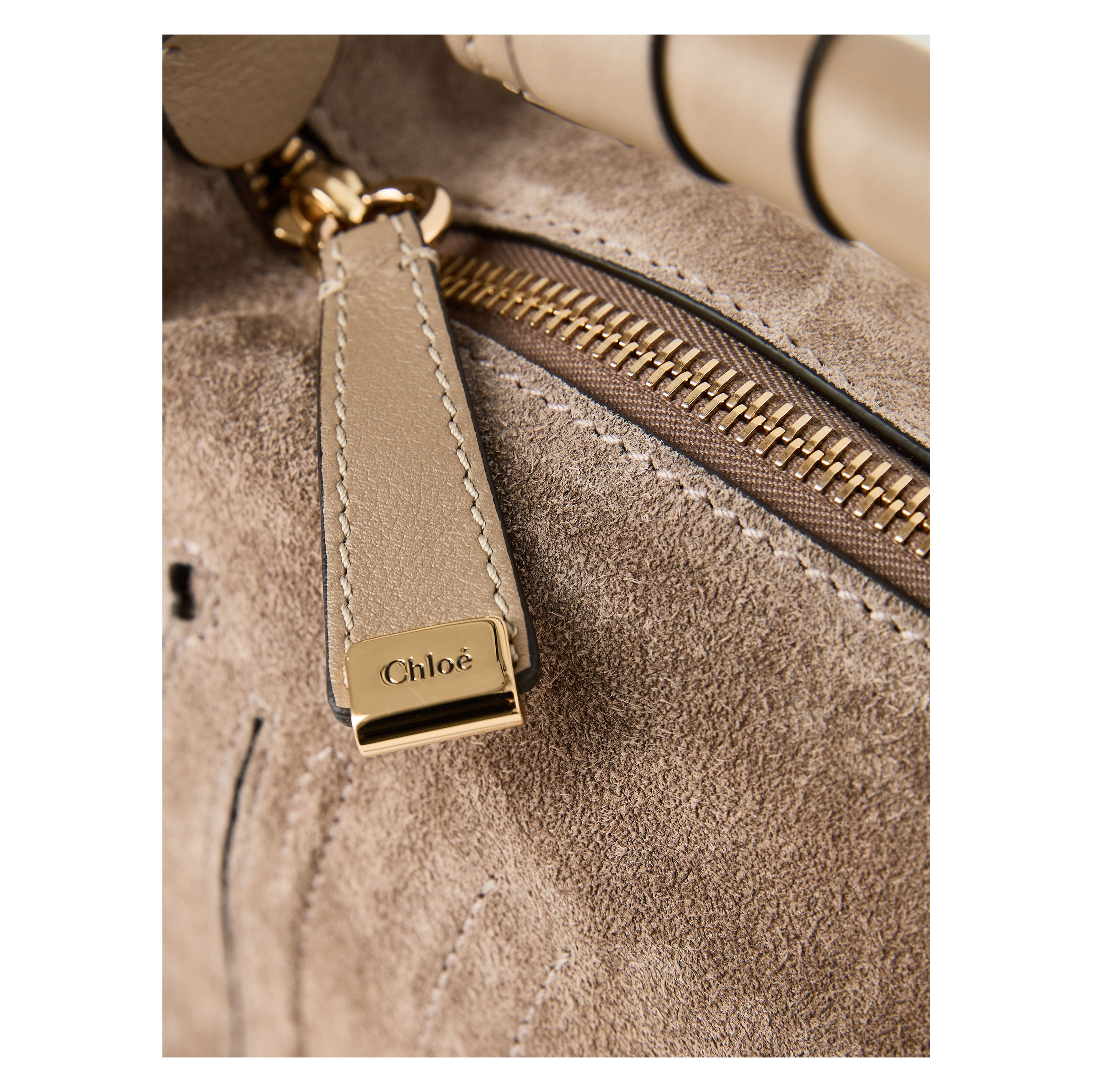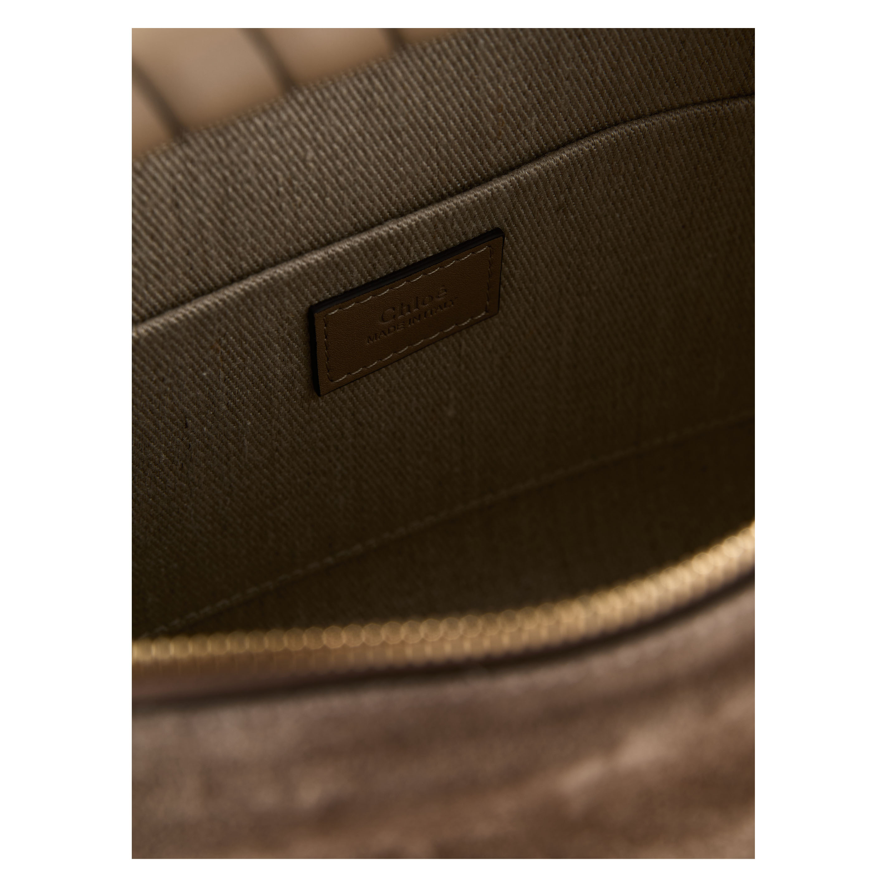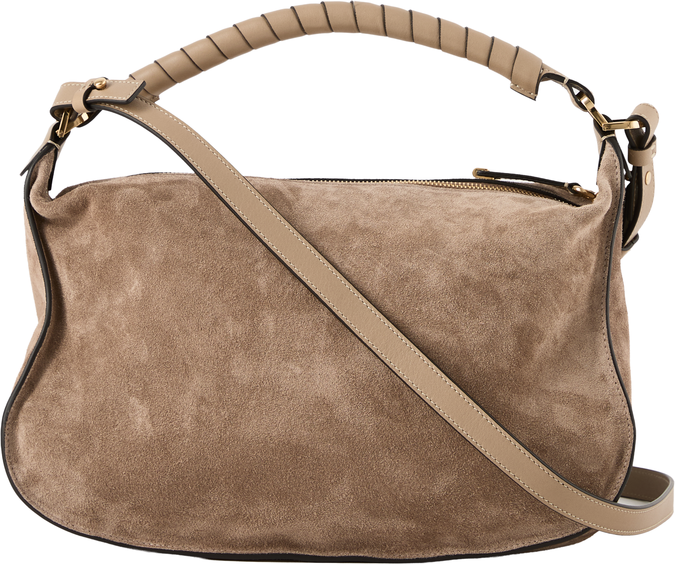 Die Handtasche 'Marcie Hobo' von Chloé in Boyish Brown wurde aus Kalbswildleder gefertigt und besticht durch die Neuinterpretation der ikonischen Day Bag mit einer lockereren Form. Die Sattelnähte, der einzelne handgewickelte Griff und die goldfarbenen Beschläge machen die Tasche zu einem sportlich-eleganten Klassiker. Die herabhängenden Lederquasten der Linie schließen den Überschlag.