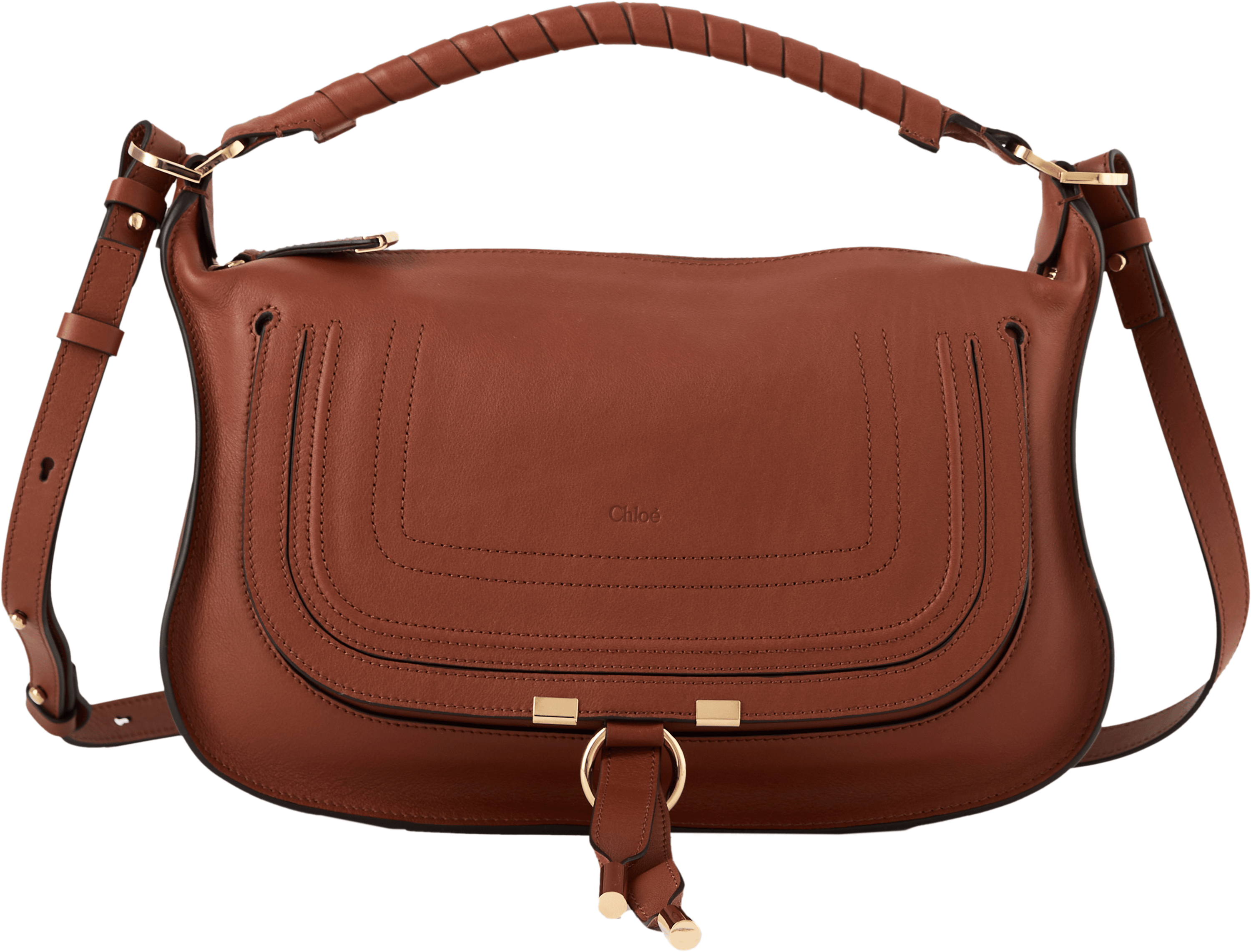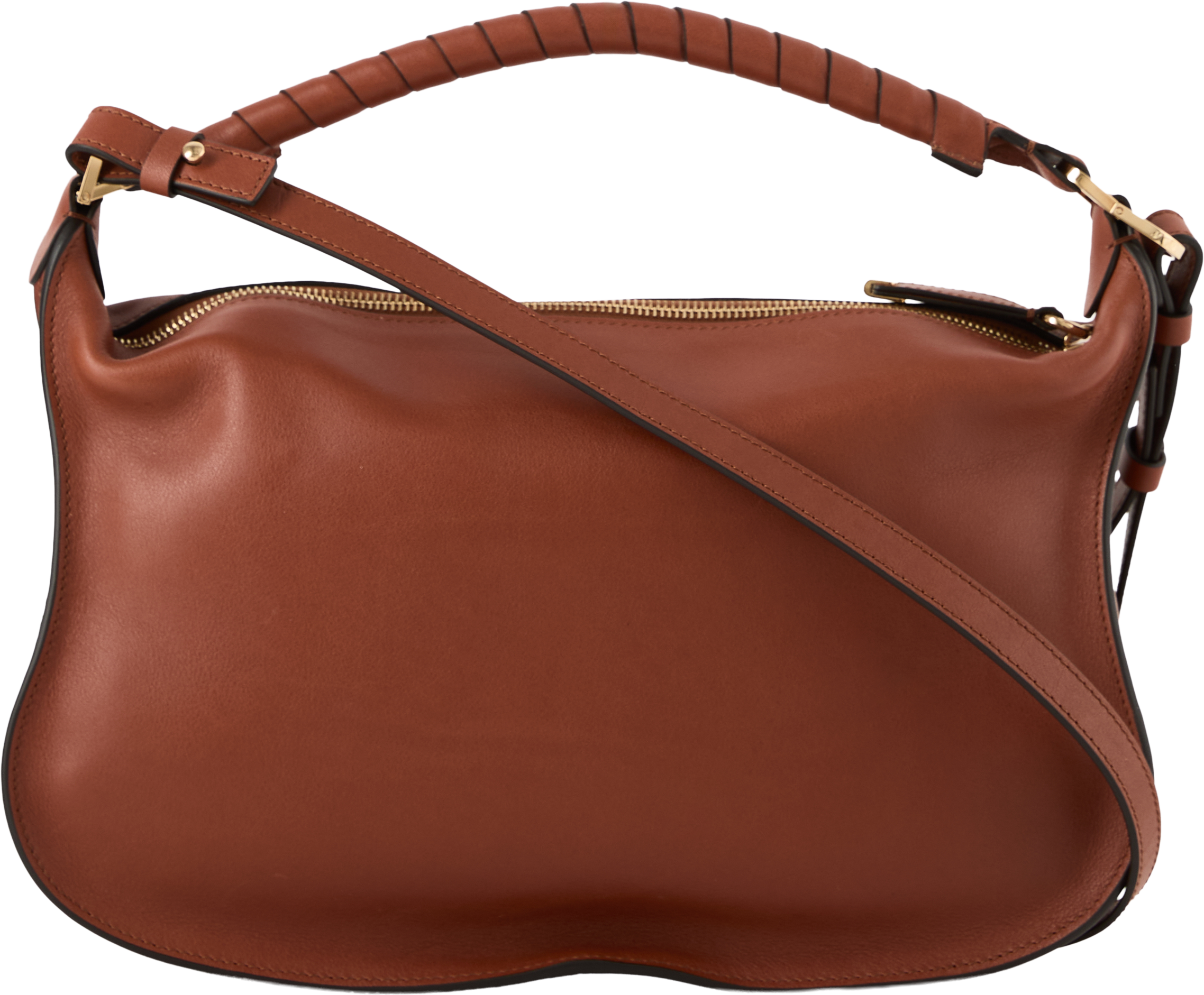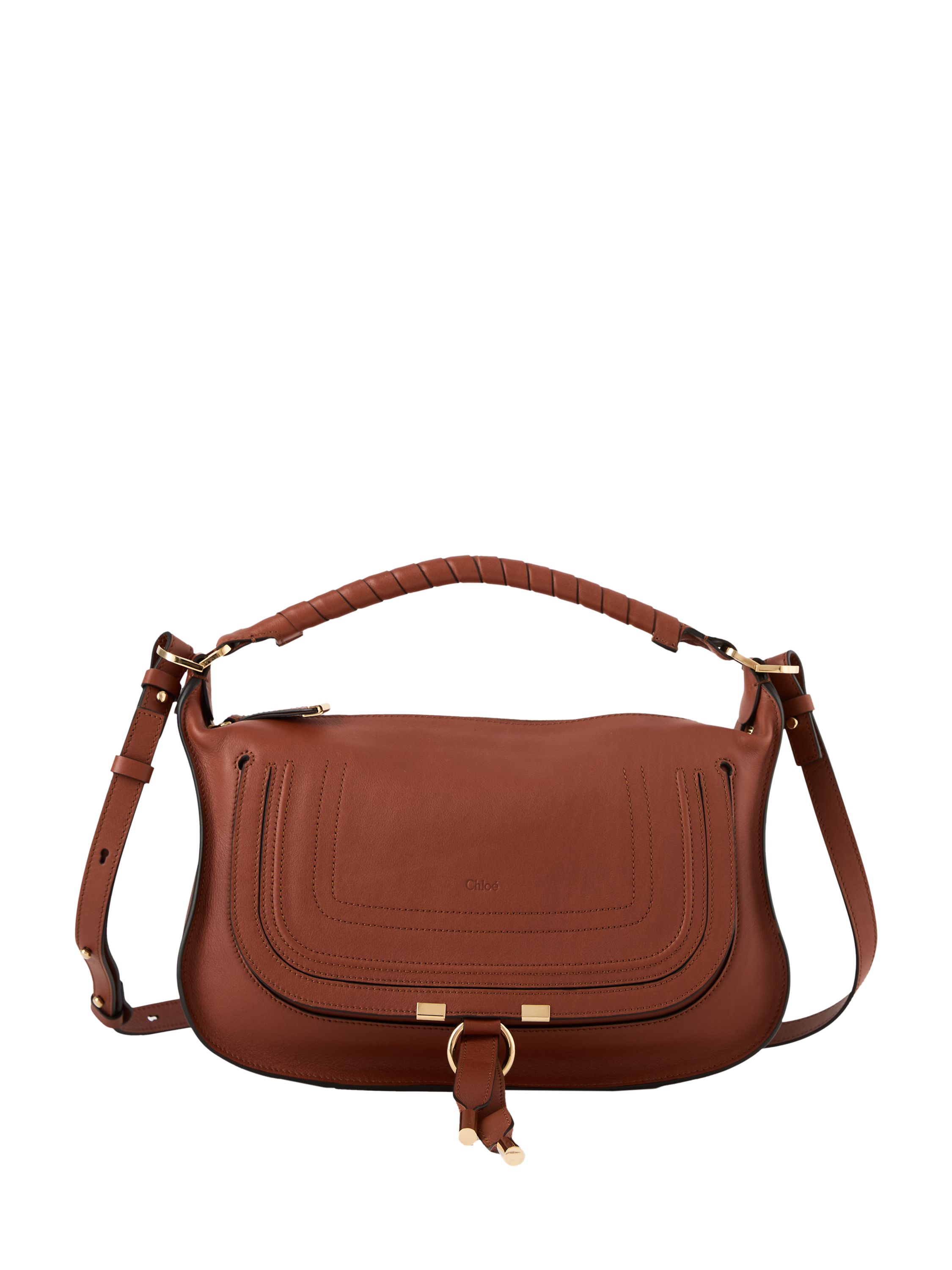 Die Handtasche 'Marcie Hobo' von Chloé in Clay Brown wurde aus glattem Kalbsleder gefertigt und besticht durch die Neuinterpretation der ikonischen Day Bag mit einer lockereren Form. Die Sattelnähte, der einzelne handgewickelte Griff und die goldfarbenen Beschläge machen die Tasche zu einem sportlich-eleganten Klassiker. Die herabhängenden Lederquasten der Linie schließen den Überschlag.