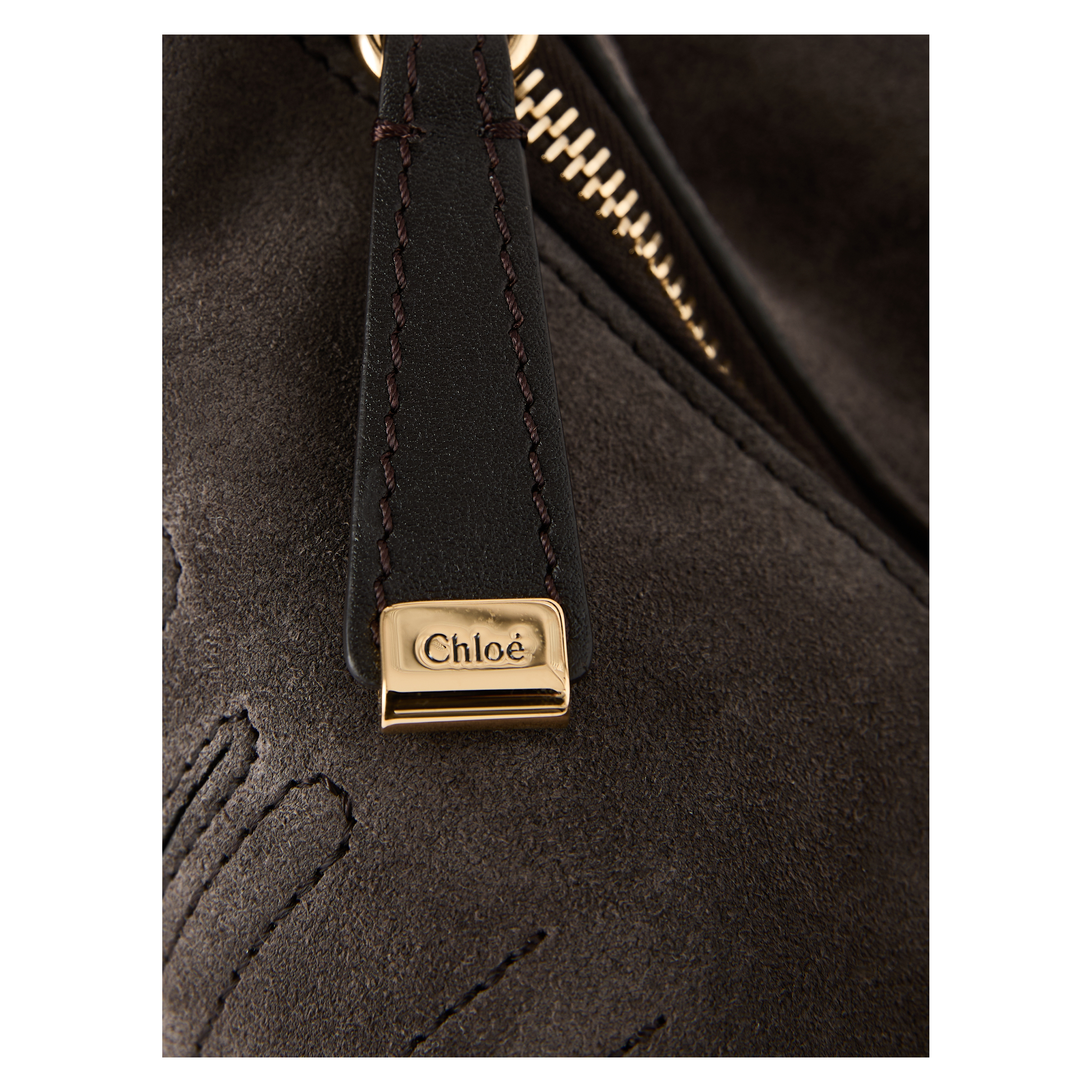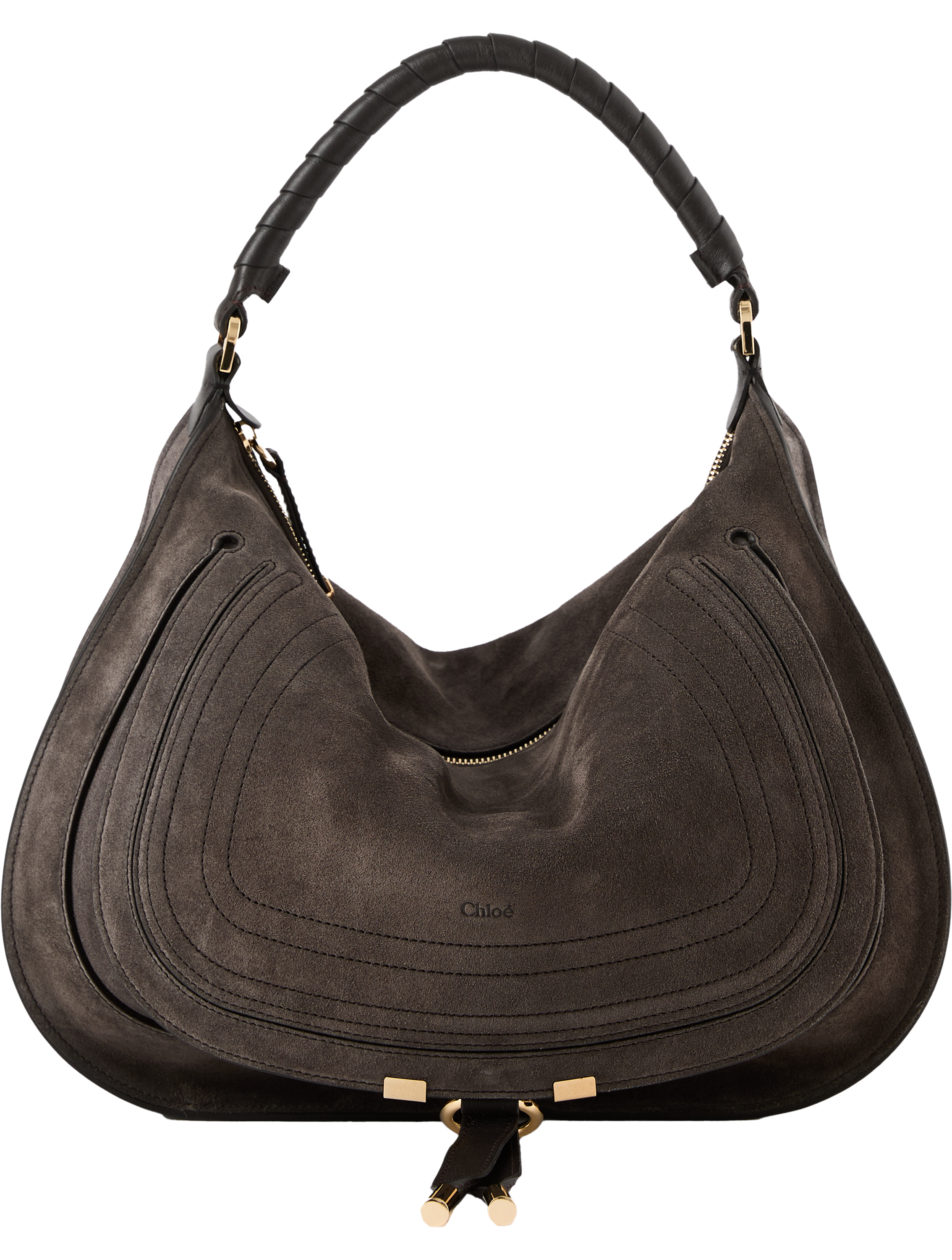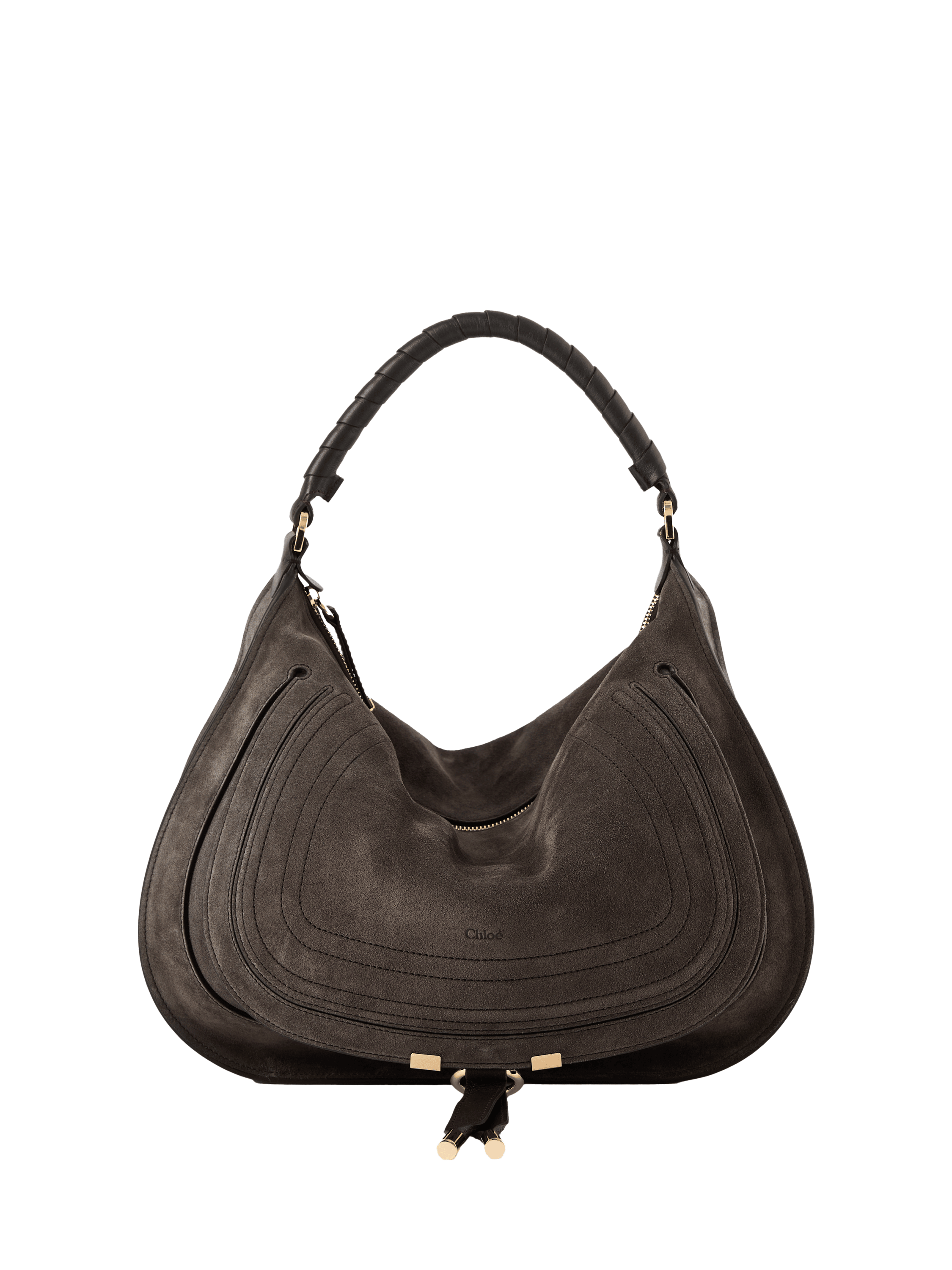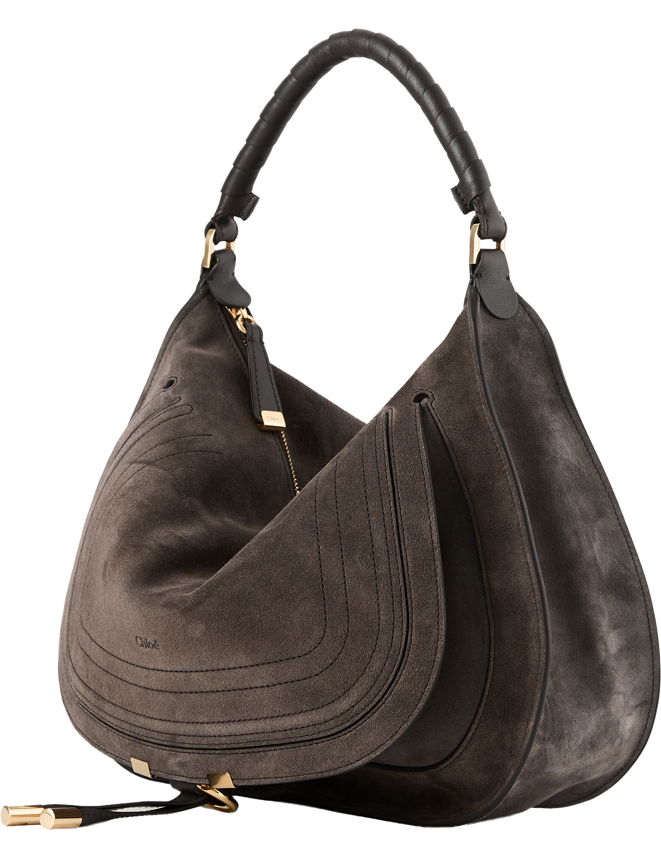 Die Handtasche 'Marcie Hobo' von Chloé in Kohl Brown wurde aus Kalbswildleder gefertigt und besticht durch die Neuinterpretation der ikonischen Day Bag mit einer lockereren Form. Die Sattelnähte, der einzelne handgewickelte Griff und die goldfarbenen Beschläge machen die Tasche zu einem sportlich-eleganten Klassiker. Die herabhängenden Lederquasten der Linie schließen den Überschlag.