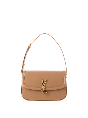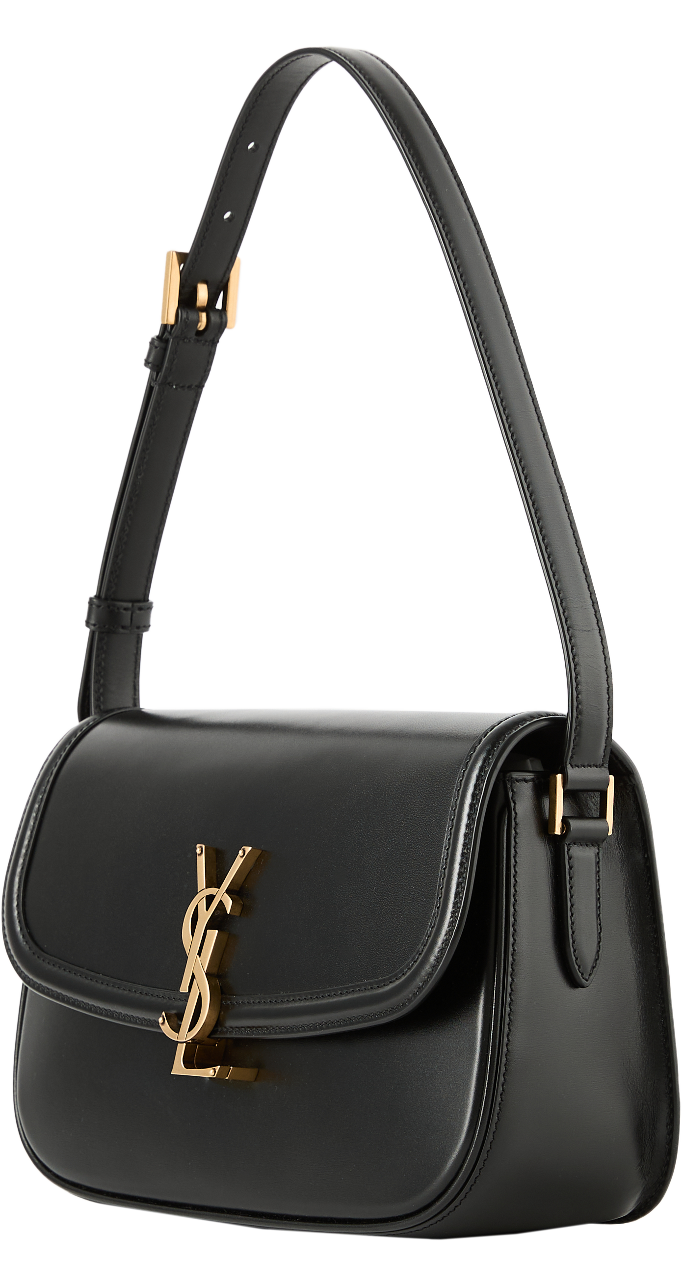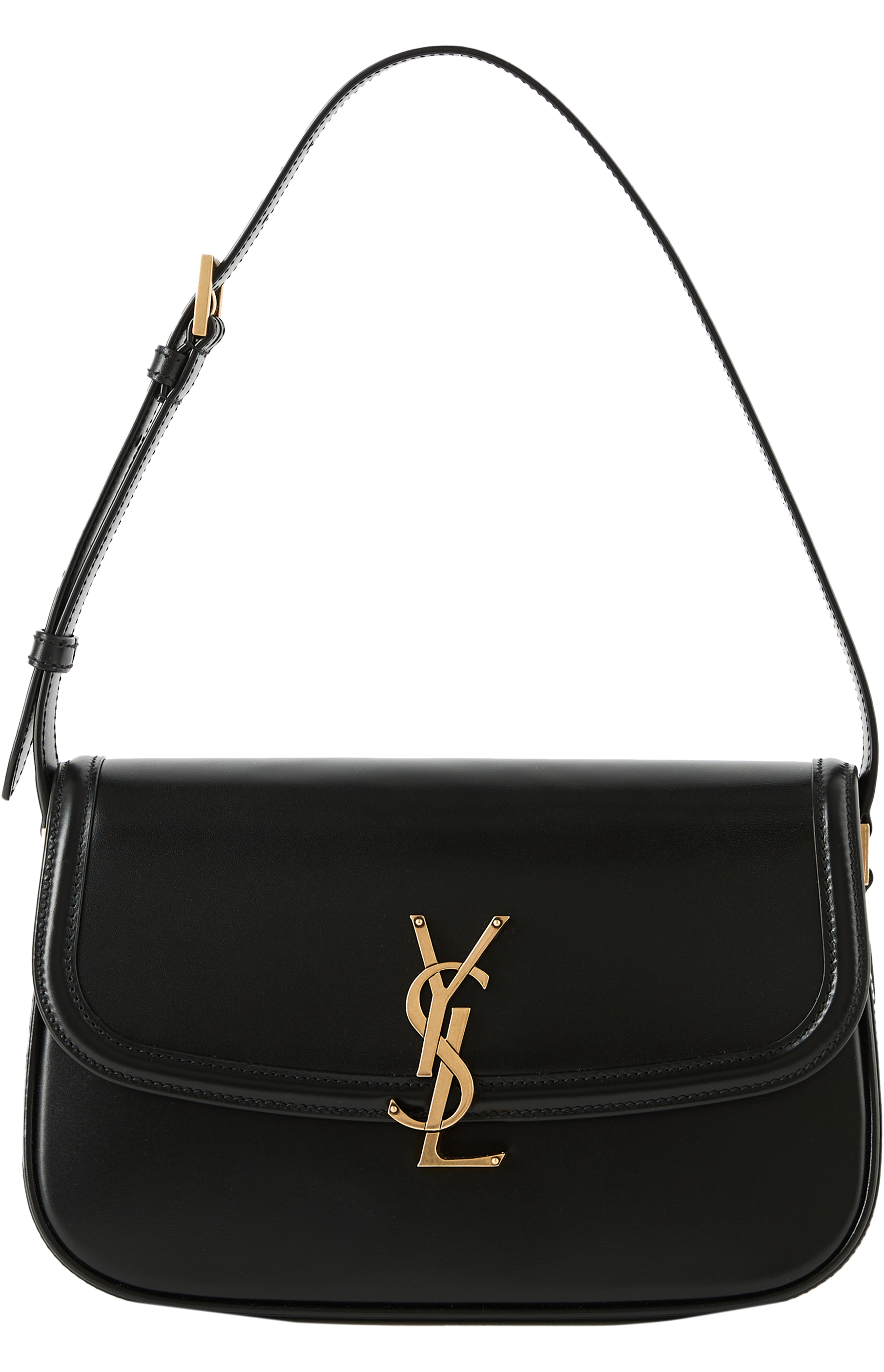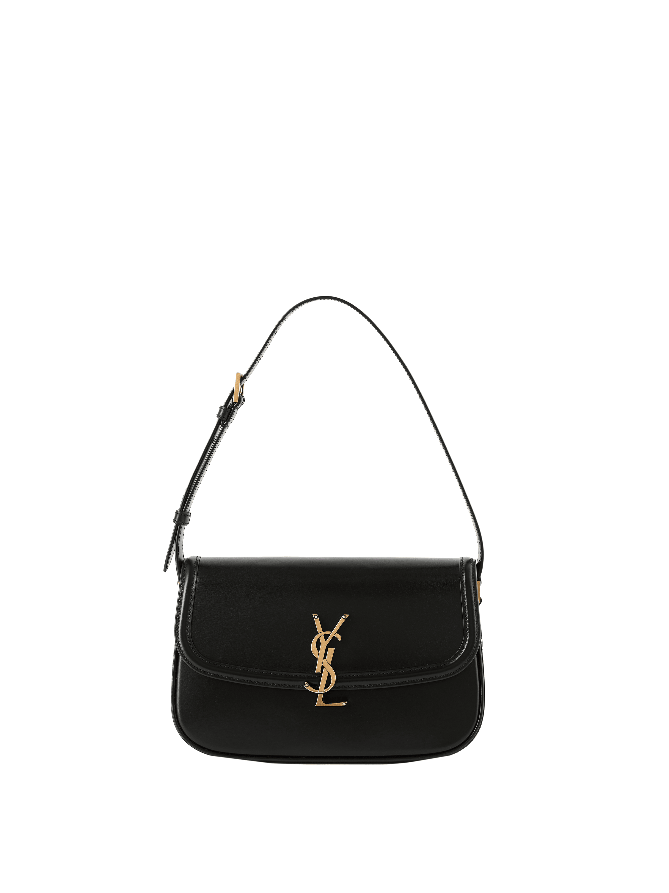 Die Schultertasche 'Solferino Medium' in Schwarz von Saint Laurent wurde aus Lammleder gefertigt und mit goldfarbener Hardware abgerundet. Die rechteckige Form wird akzentuiert durch eine Frontklappe, einen drehbaren YSL-Verschluss sowie einen verstellbaren Schulterriemen.