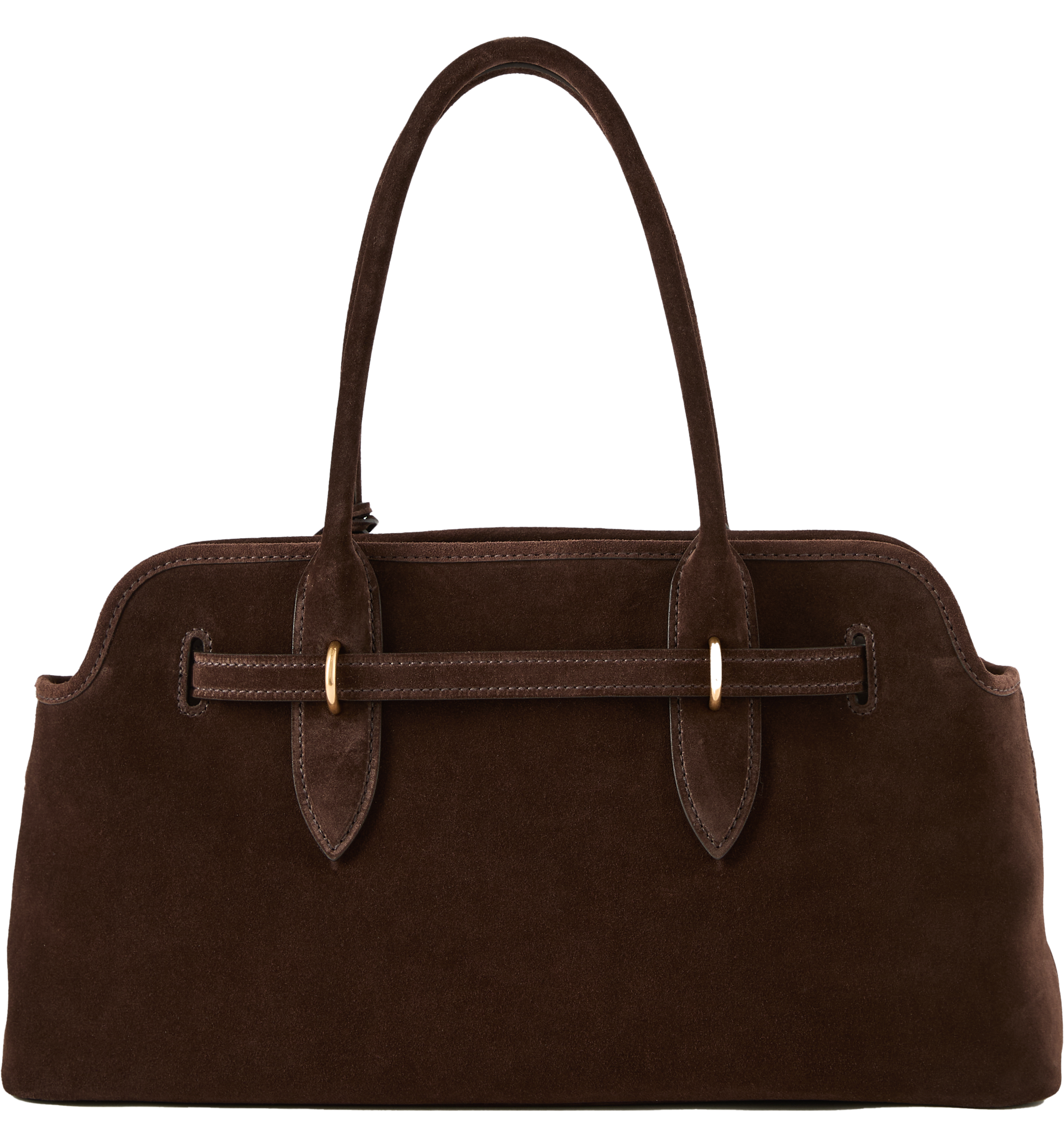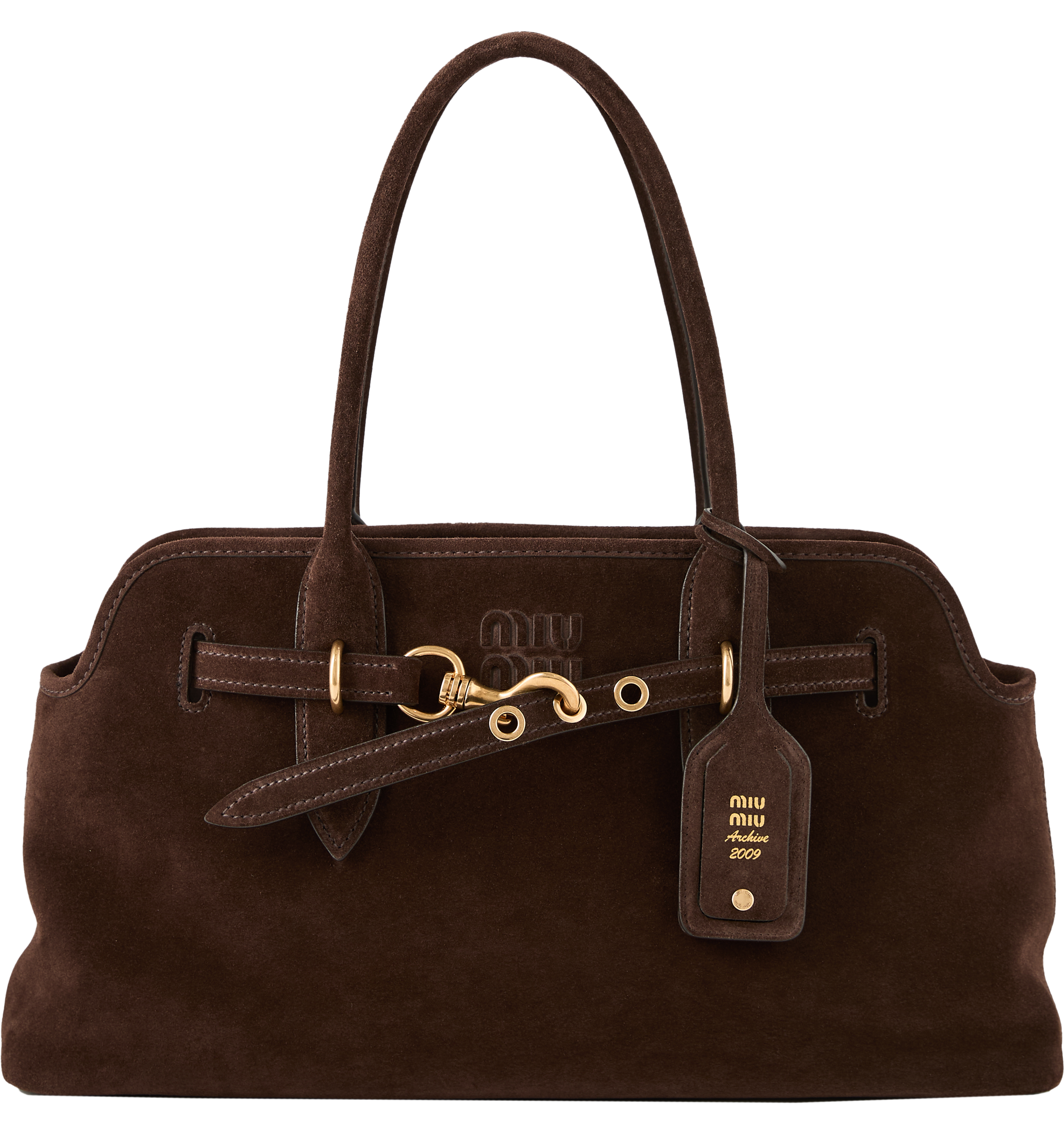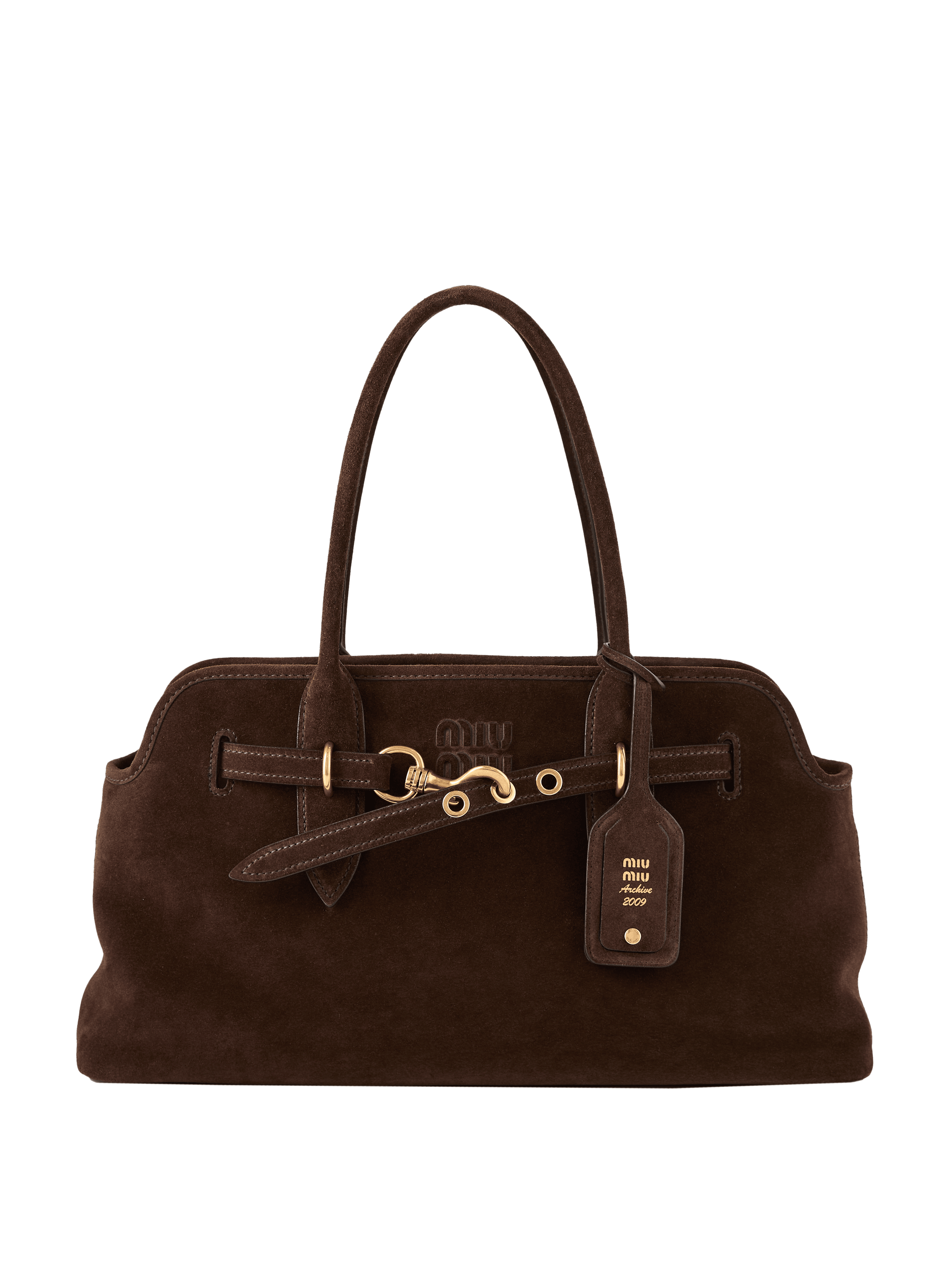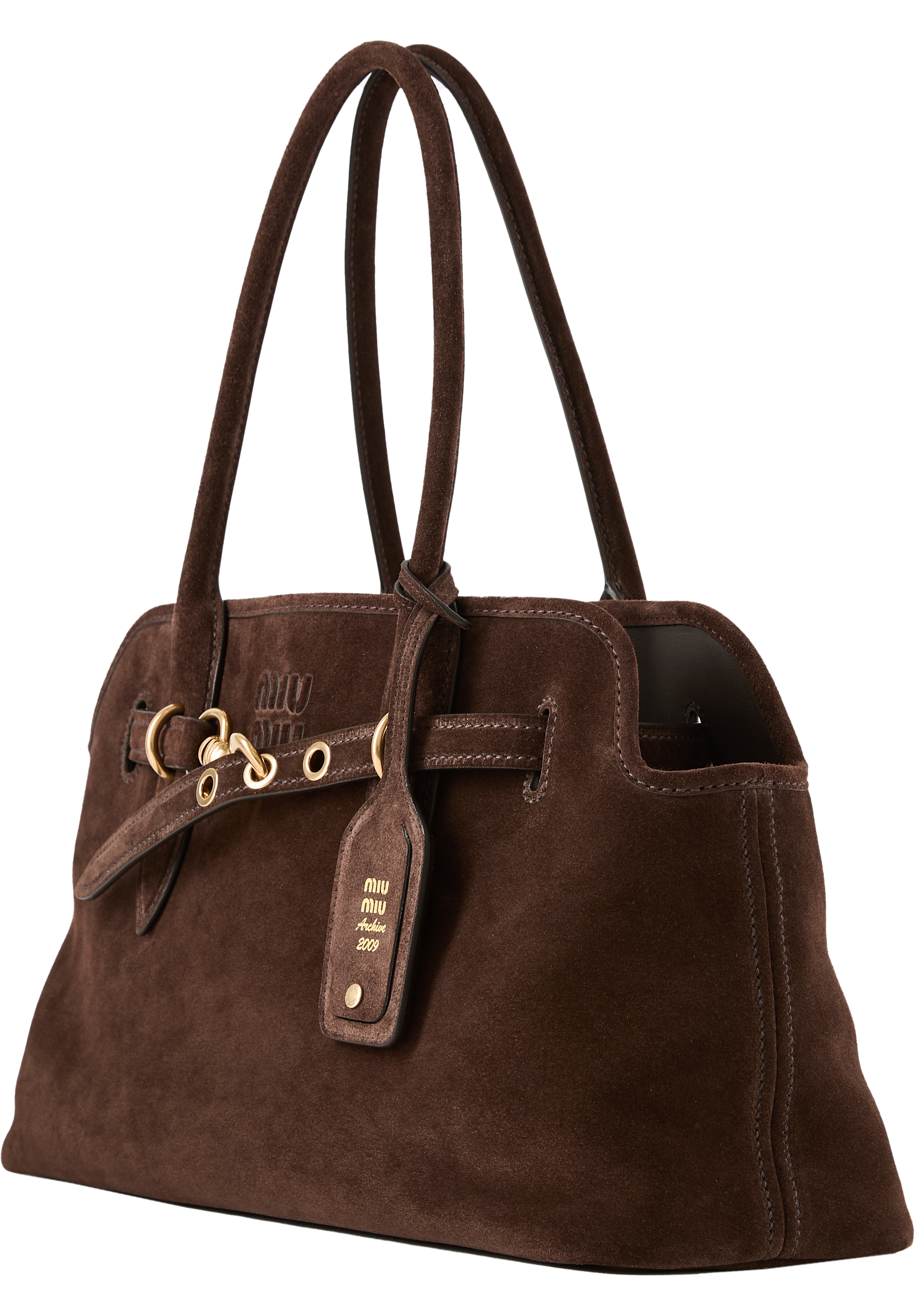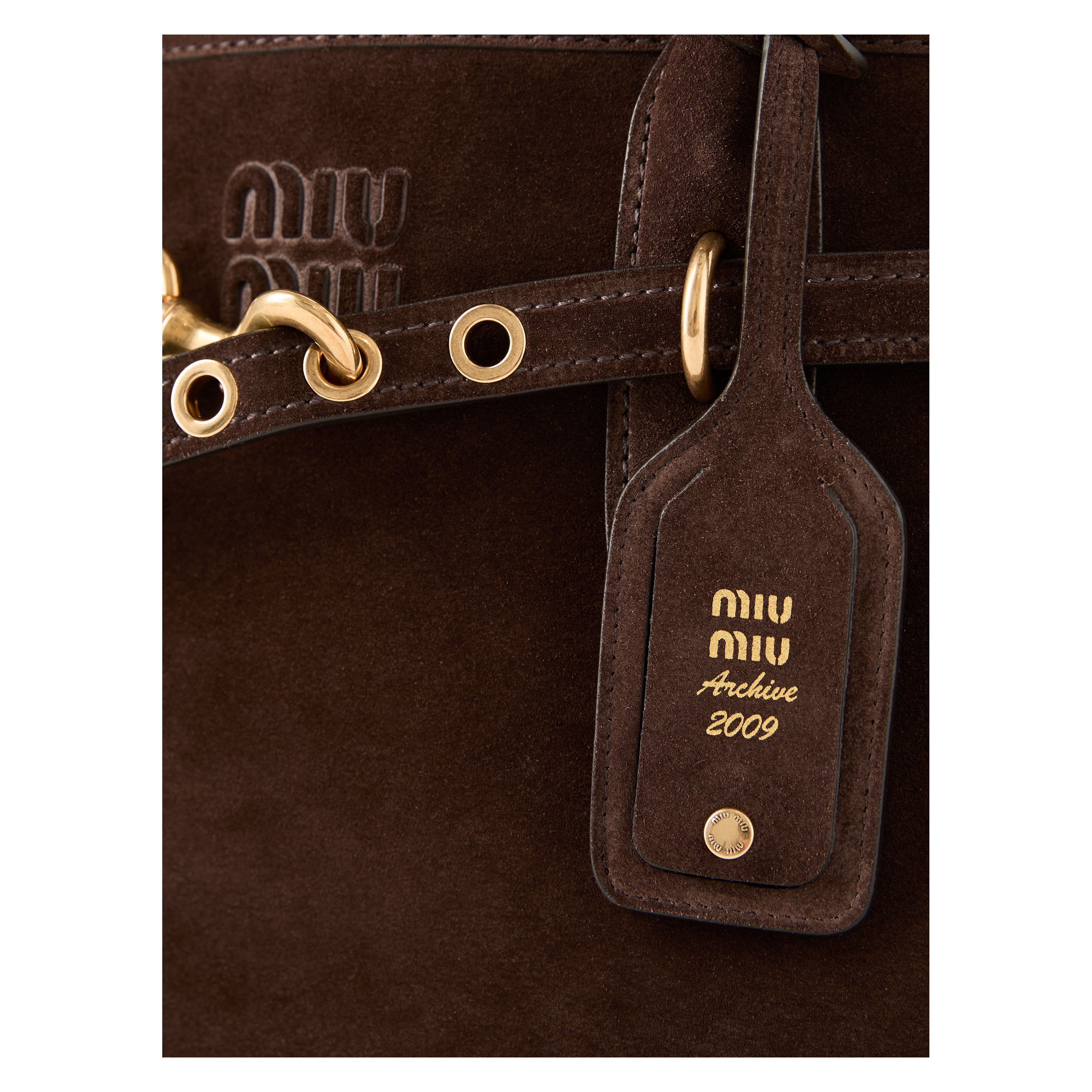 Der Shopper 'Aventure' in Dunkelbraun von miu miu ist vom ikonischen Modell von 2009 inspiriert und wurde aus hochwertigem Kalbs-Veloursleder gefertigt. Das Modell wird durch den ikonischen geprägten Logo-Schriftzug, den Karabinerhaken und die goldfarbene Hardware stilvoll ergänzt.