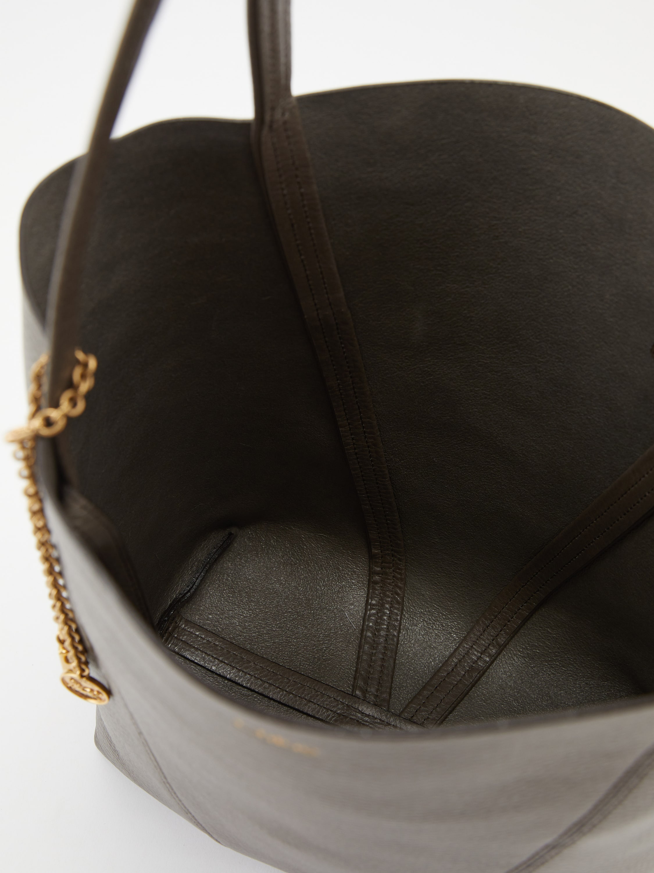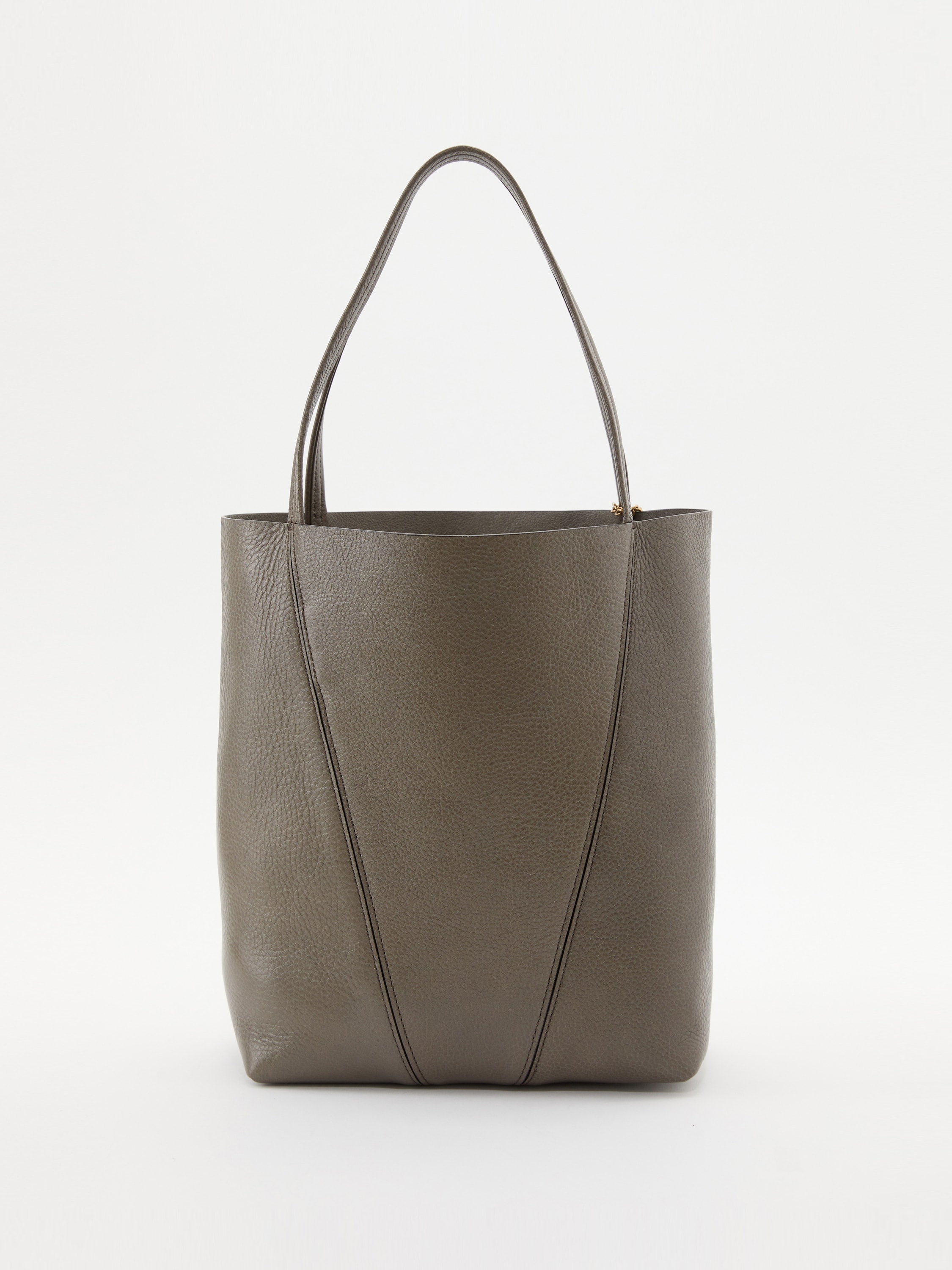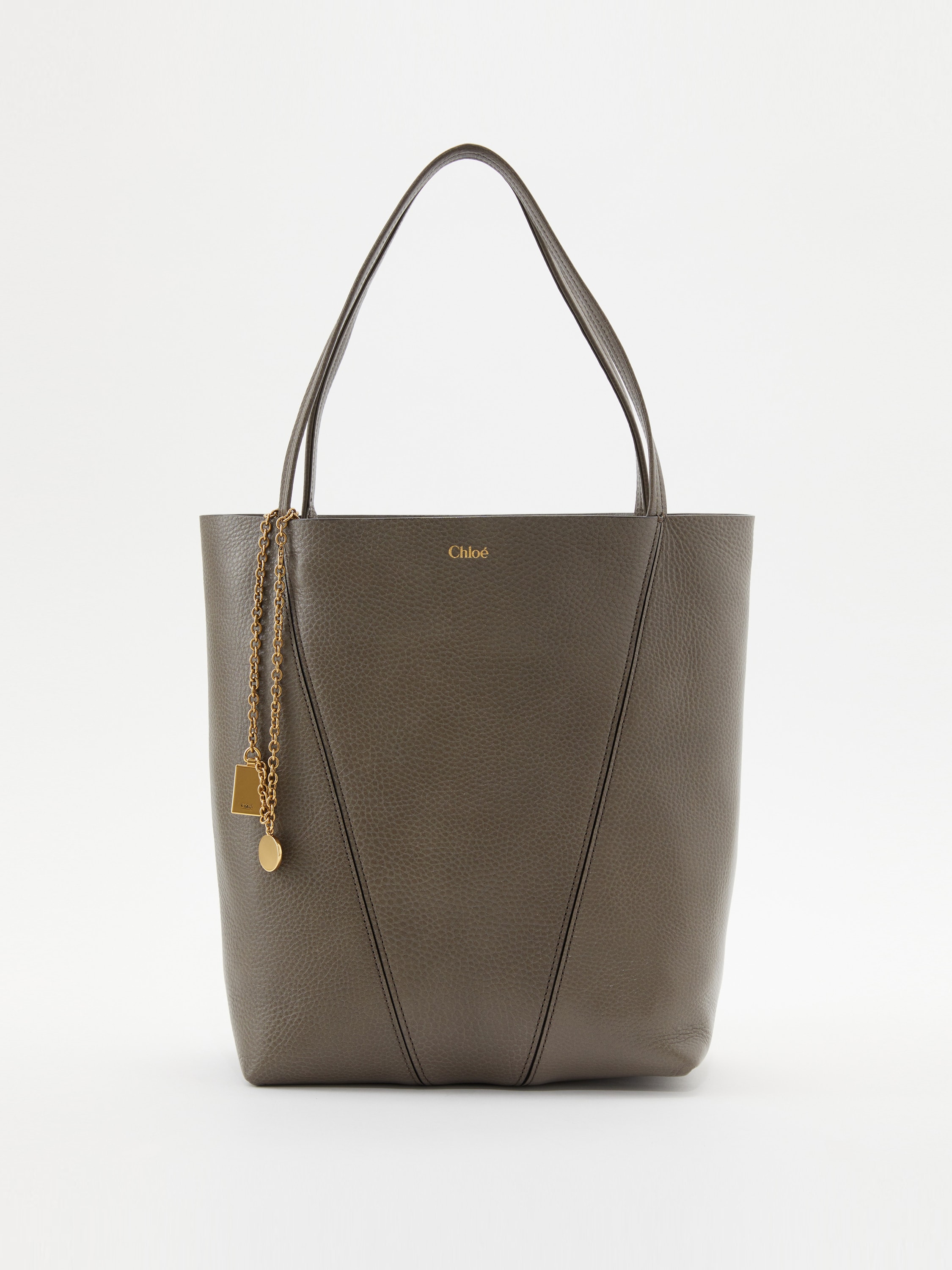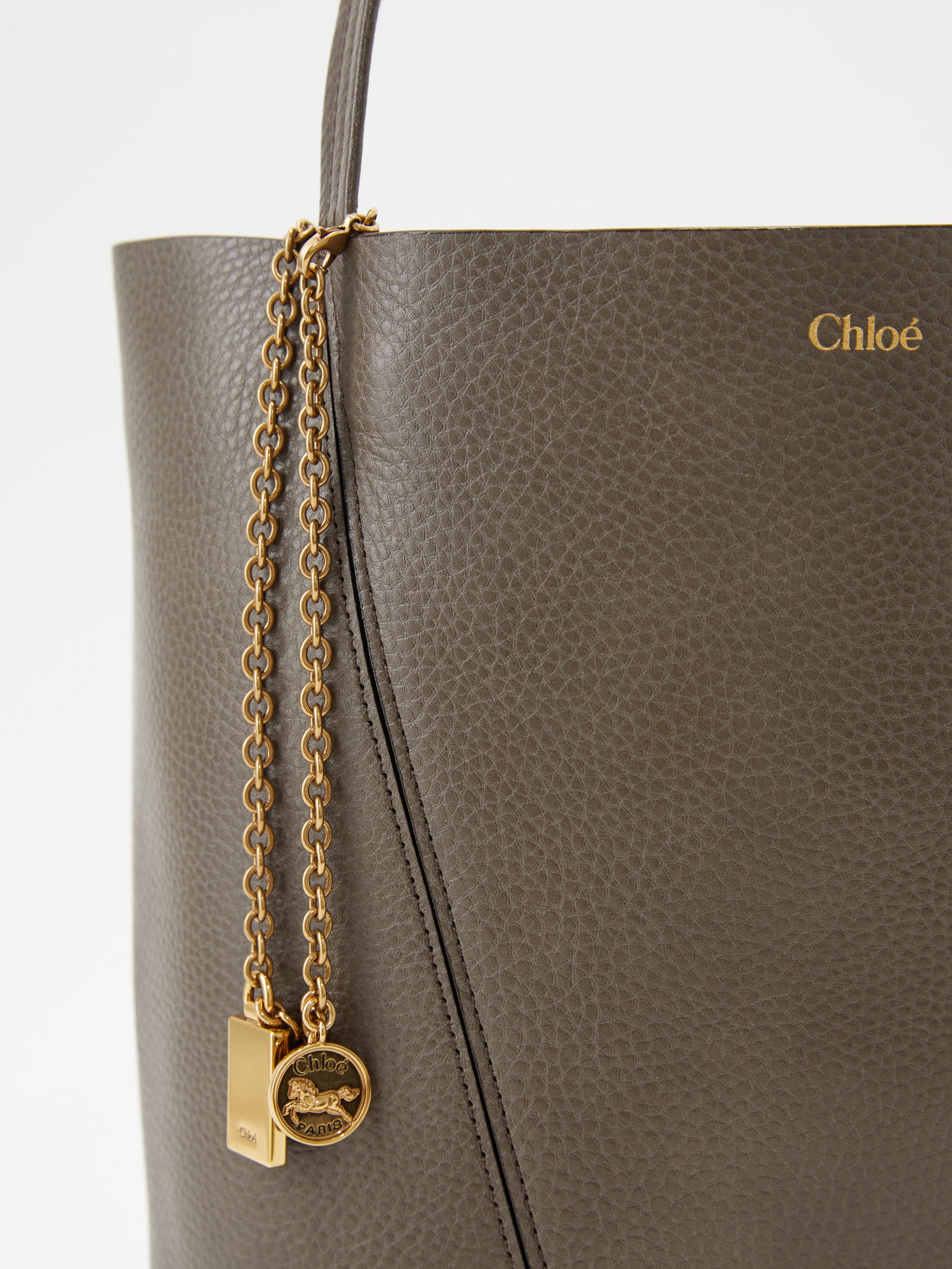 Der Shopper 'Spin Medium' in Flannel Grey von Chloé wurde aus Rindsleder gefertigt. Das goldfarbene Finish und das Logo auf der Vorderseite verleihen dem Modell seine Eleganz.