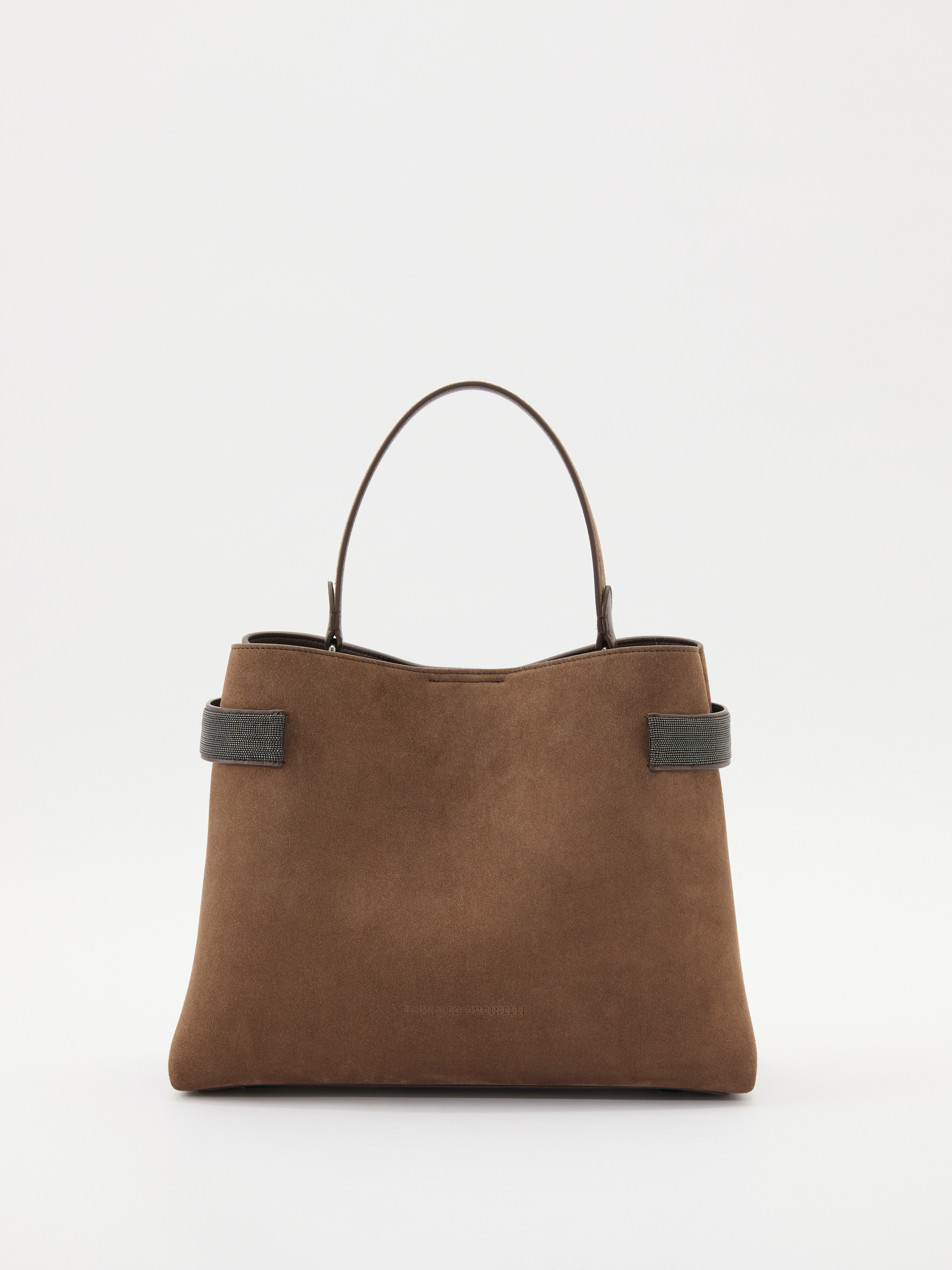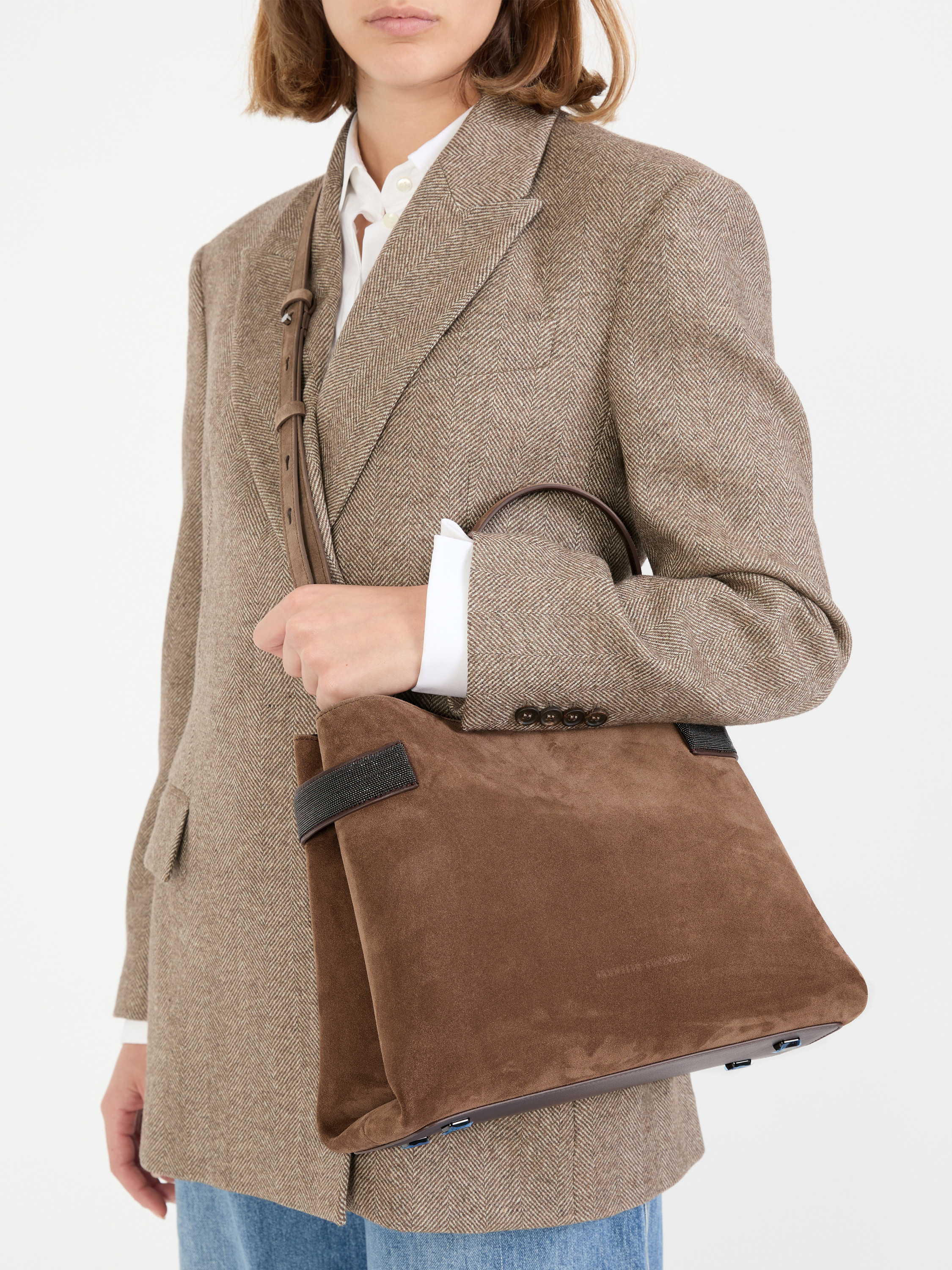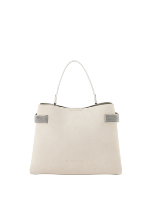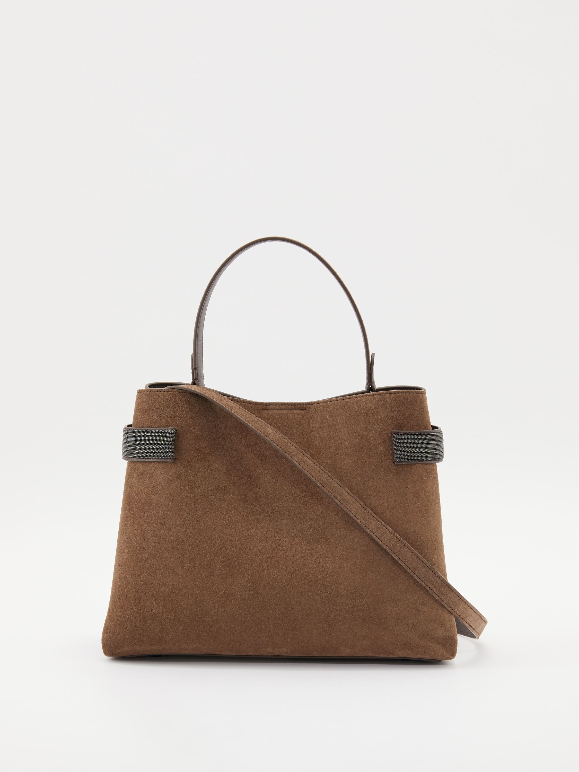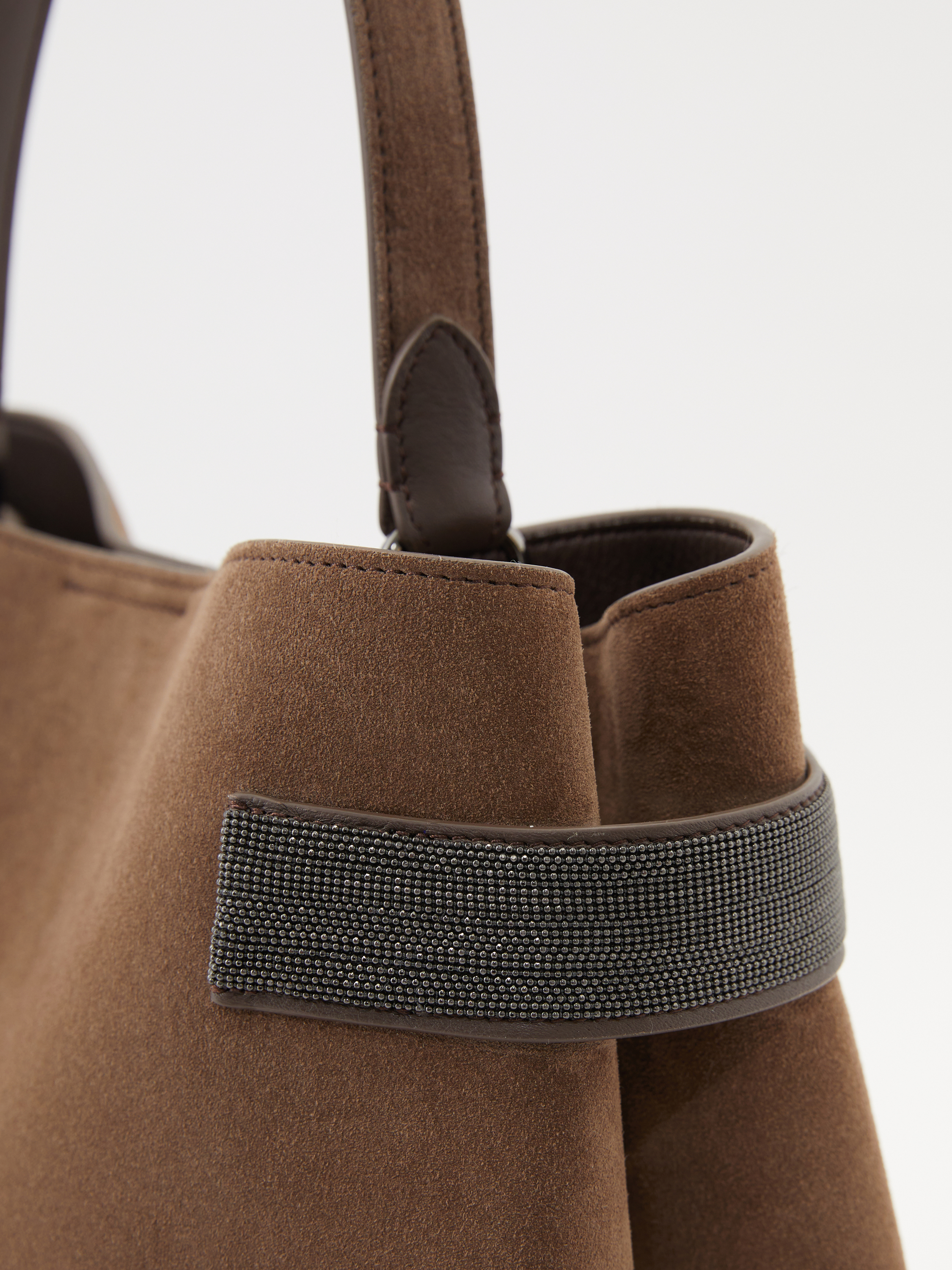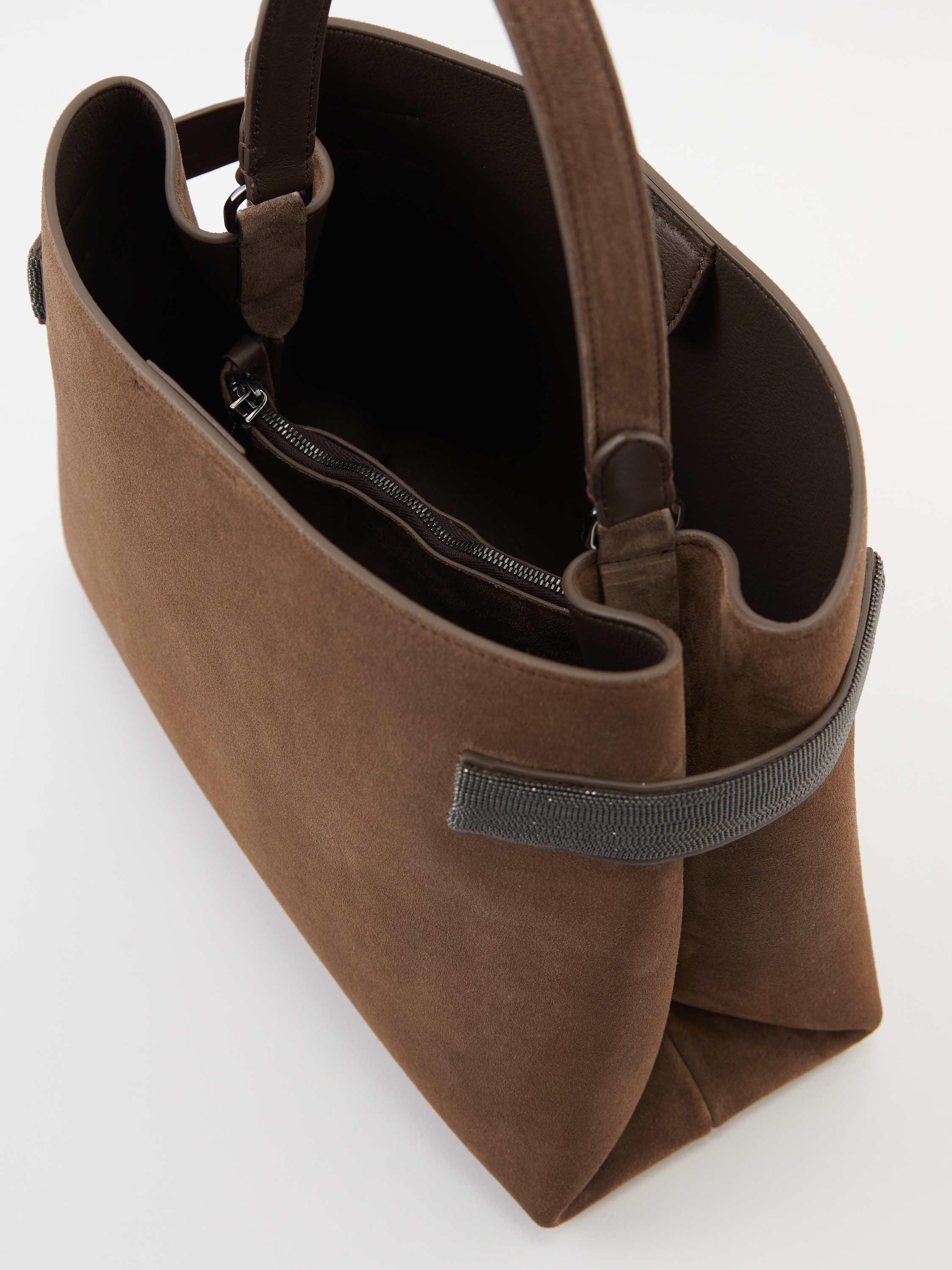 Die Handtasche 'Essence' in Braun von Brunello Cucinelli wurde aus Veloursleder gefertigt und besticht durch das Monili-Perlen-Detail. Das edle Modell wird durch den Trageriemen aus Glattleder bereichert. Ein Innenfach mit Reißverschluss bietet Stauraum für kleine Dinge des Alltags.
