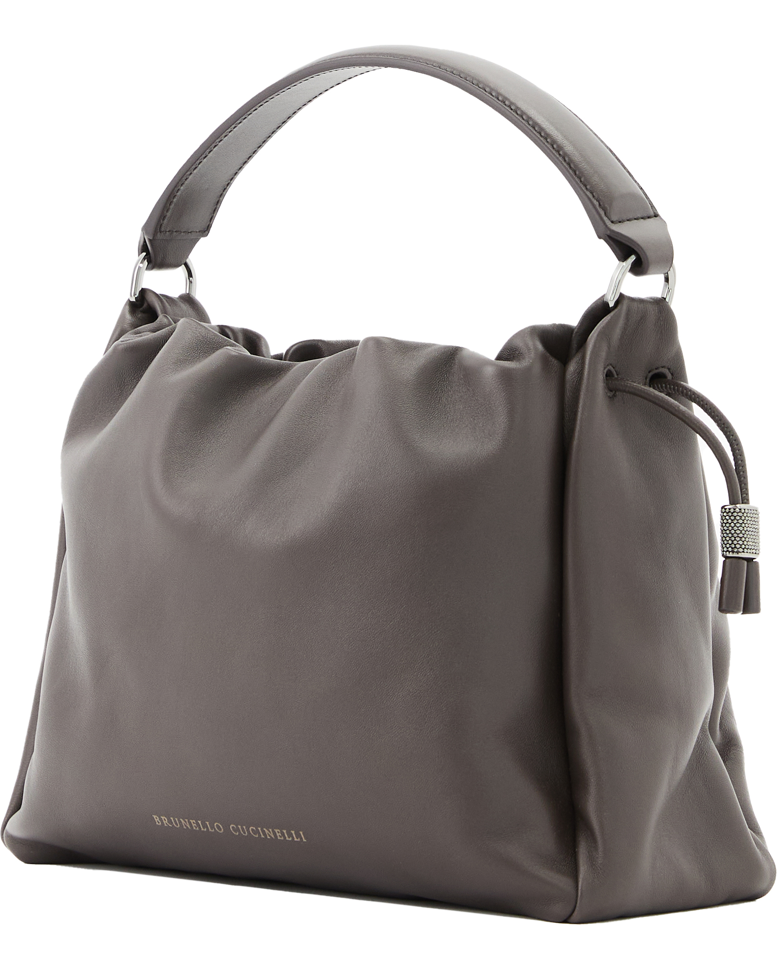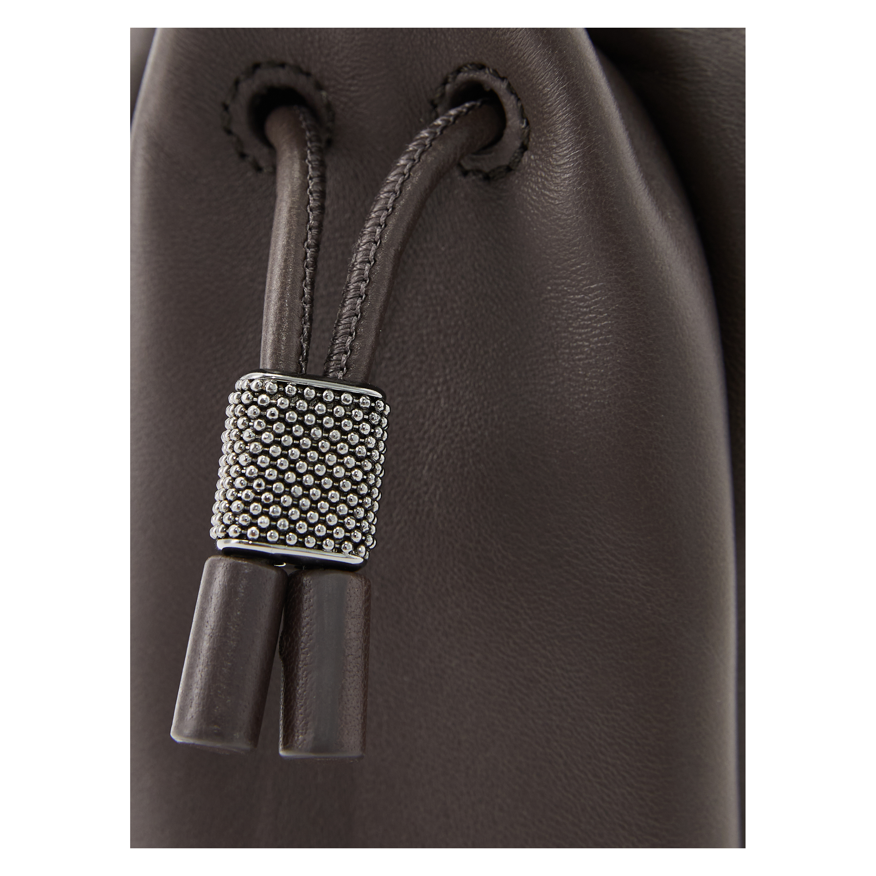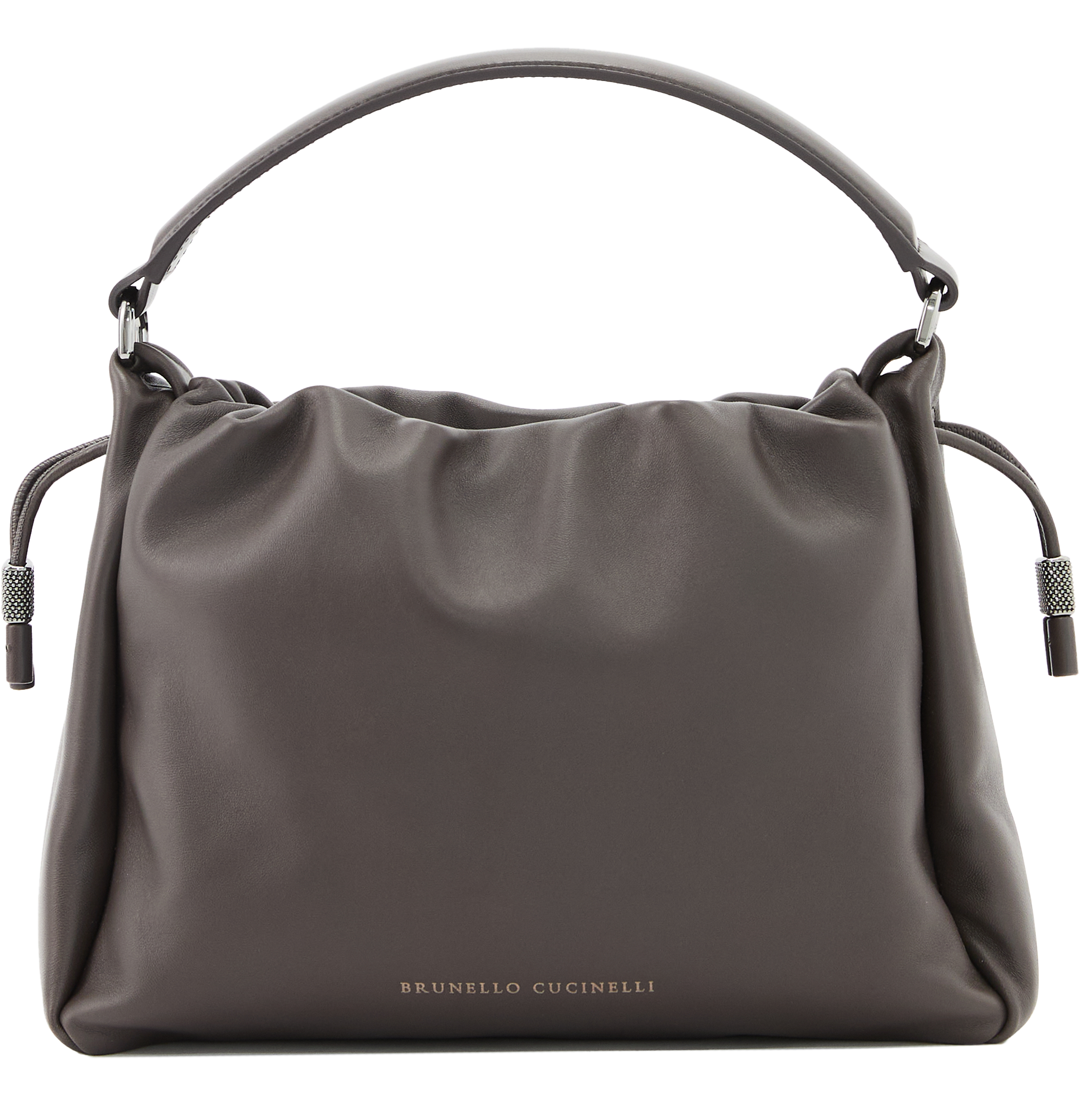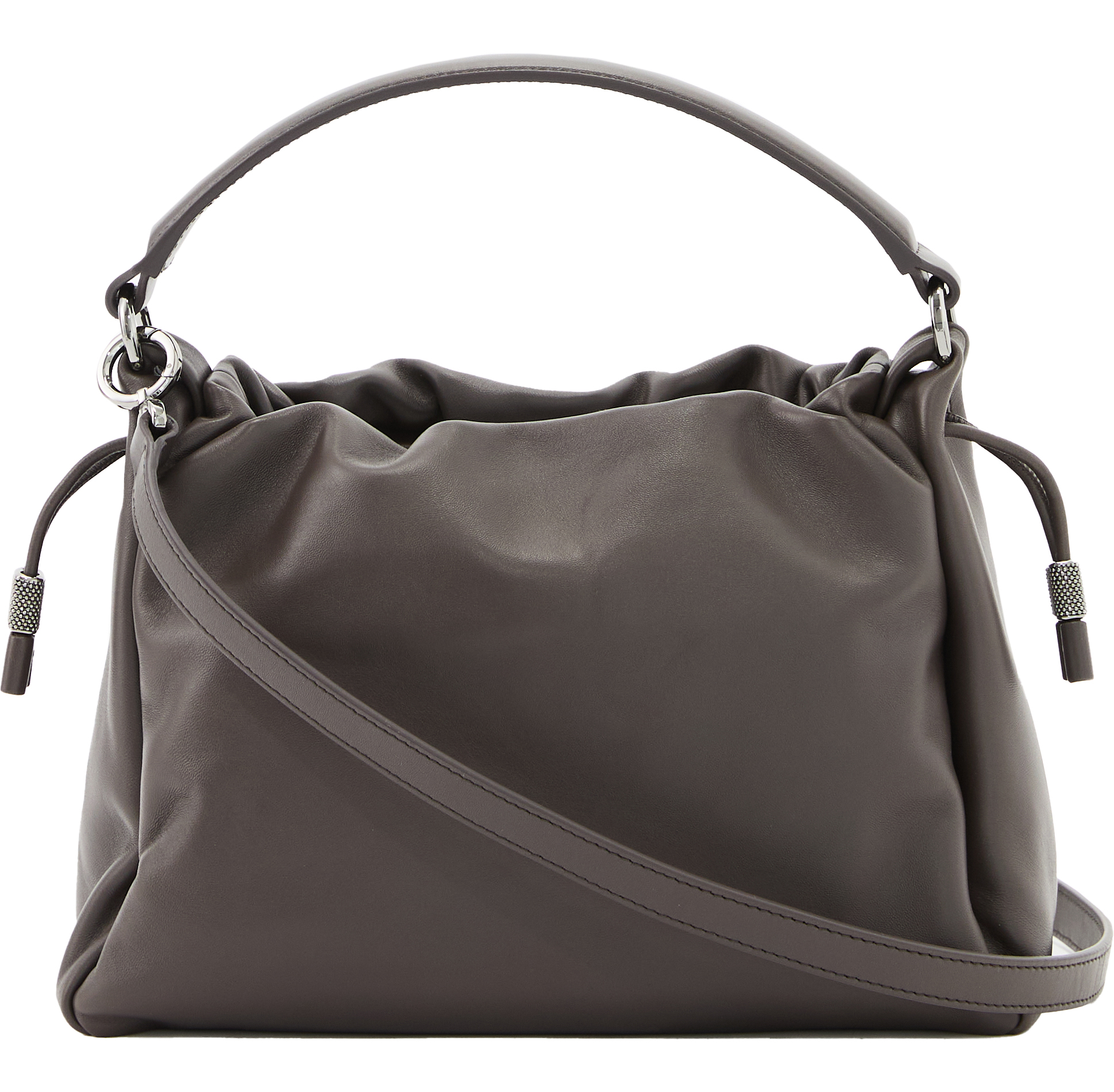 Die Handtasche 'Mellow Small' in Dunkelbraun von Brunello Cucinelli wurde aus hochwertigem Leder gefertigt und durch silberfarbene Hardware ergänzt. Das Design zeichnet sich durch einen abnehmbaren Schulterriemen, ein Reißverschlussfach und die Monili-Perlen am Tunnelzug aus.