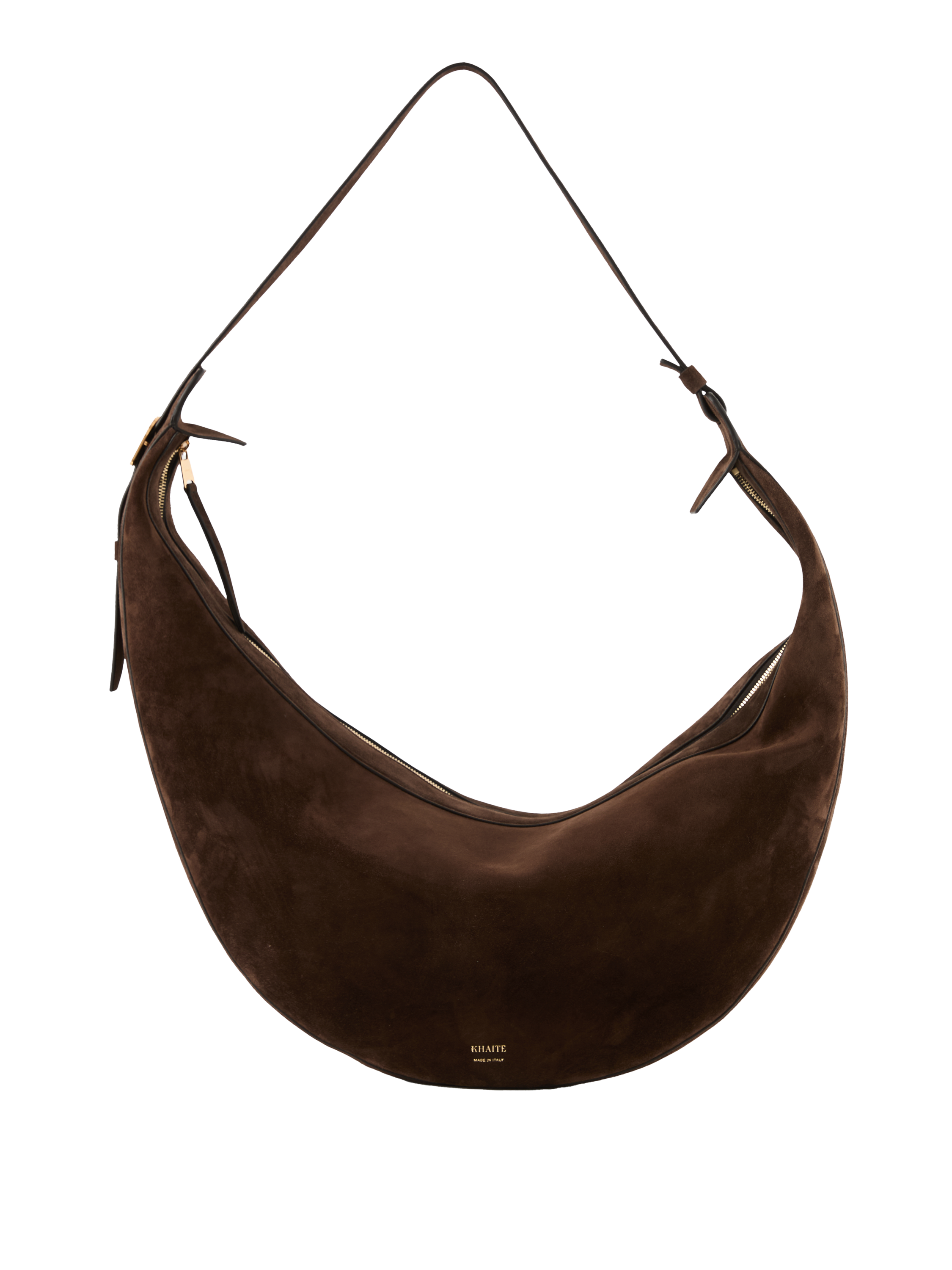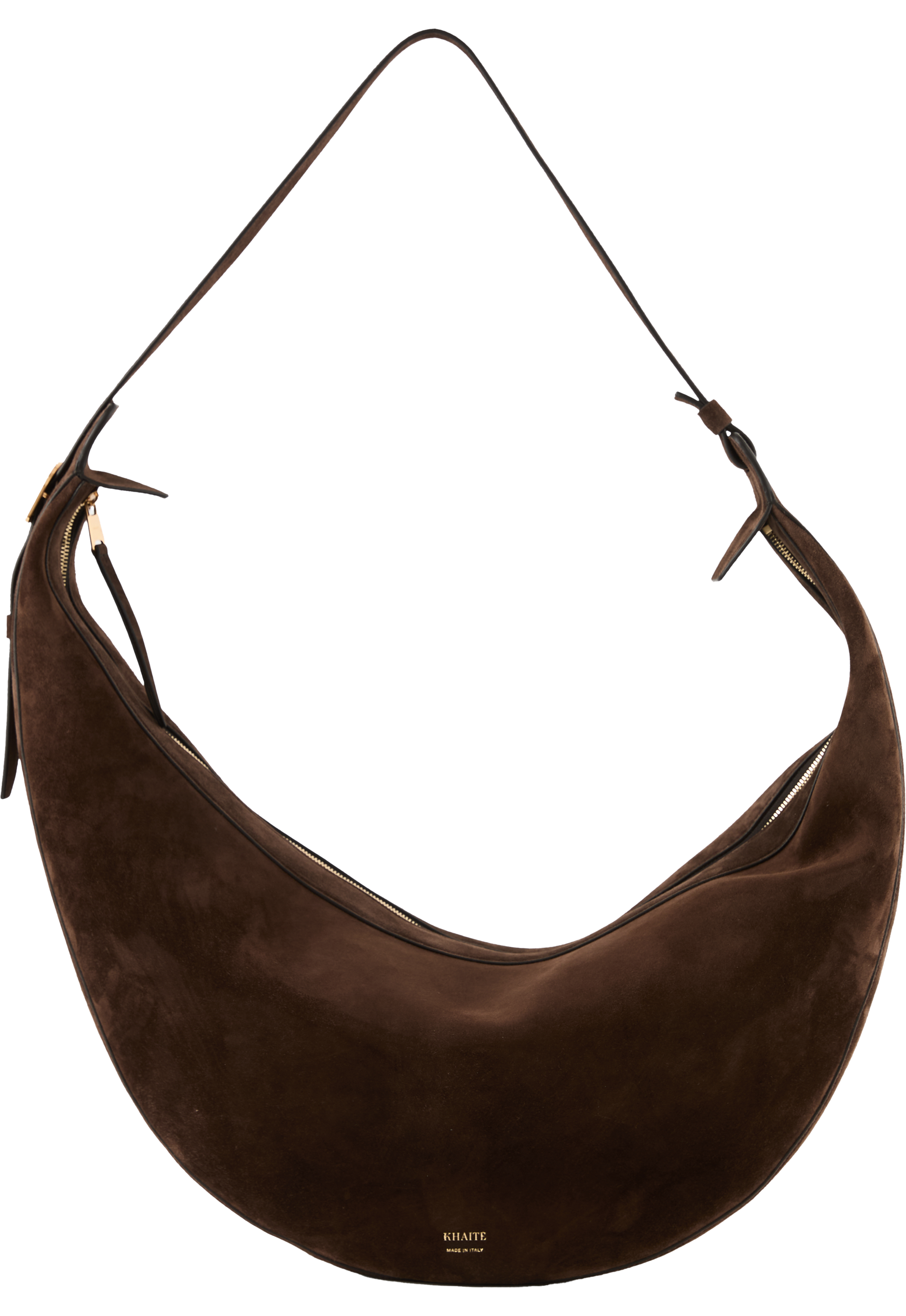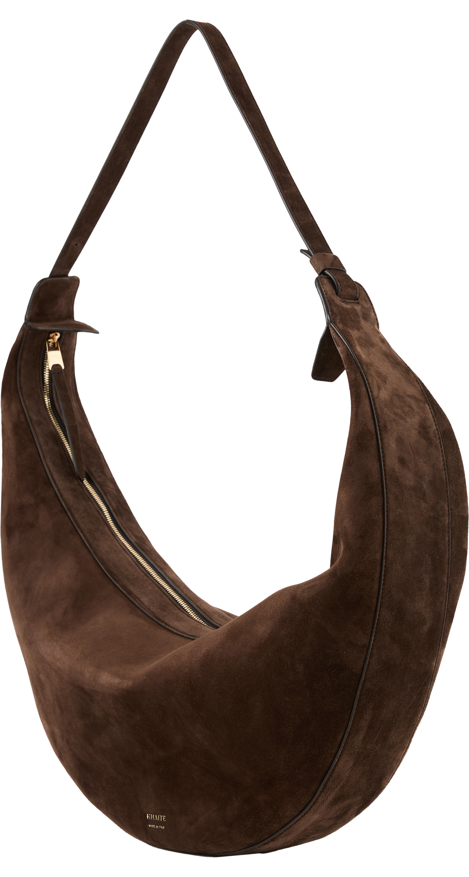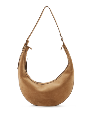 Die Umhängetasche 'Augustina' in Dunkelbraun von Khaite wurde aus hochwertigem Kalbsleder gefertigt und besticht durch klare Linien und makellose Verarbeitung. Der integrierte Riemen lässt sich verstellen, um die Tasche über der Schulter oder am Körper zu tragen.